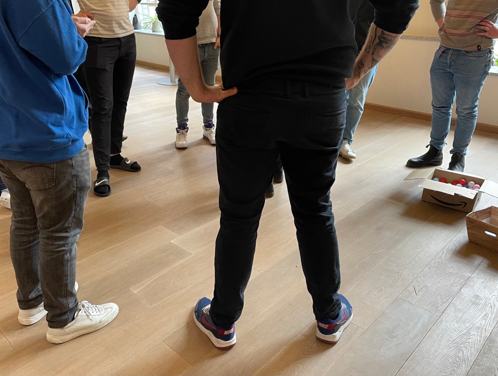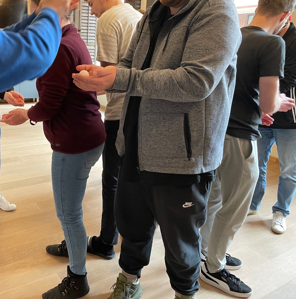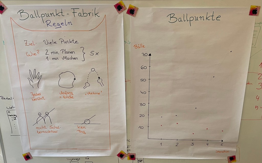 Anschließend fachsimpelten meine Kolleginnen und Kollegen nach geeigneten Strategien, um möglichst viele Punkte im von mir und meiner Kollegin M organisierten Spiel „Ballpunkt-Fabrik“ zu erzielen. Fünf Durchgänge hatten sie Zeit, um die bestmögliche Methode auszuprobieren. Anfangs landeten lediglich 12, am Ende sogar 71 Bälle im Karton. Hut ab!