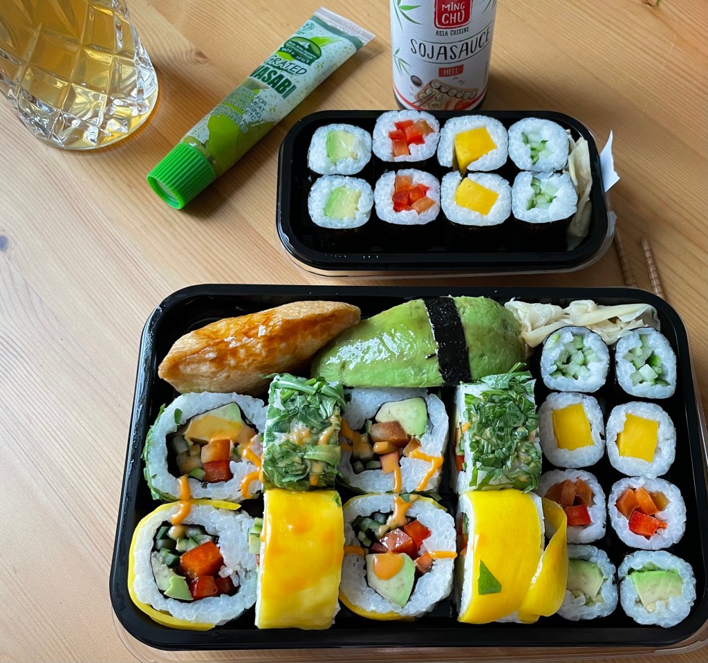 L hatte schon gestern Abend Appetit auf Sushi. Allerdings hatte ich nicht mehr genug Kalorien übrig, weshalb ich sie auf heute Abend vertröstete. Nach dem Abholen aus der Schule kauften wir uns im Marktkauf leckeres Sushi von Eat Happy. Hier stimmt für mich das Preis-Leistungs-Verhältnis noch. Ich kann mich tatsächlich schon gar nicht mehr daran erinnern, wann ich das letzte Mal in einem Sushirestaurant gegessen oder Sushi zu uns nach Hause bestellt habe.