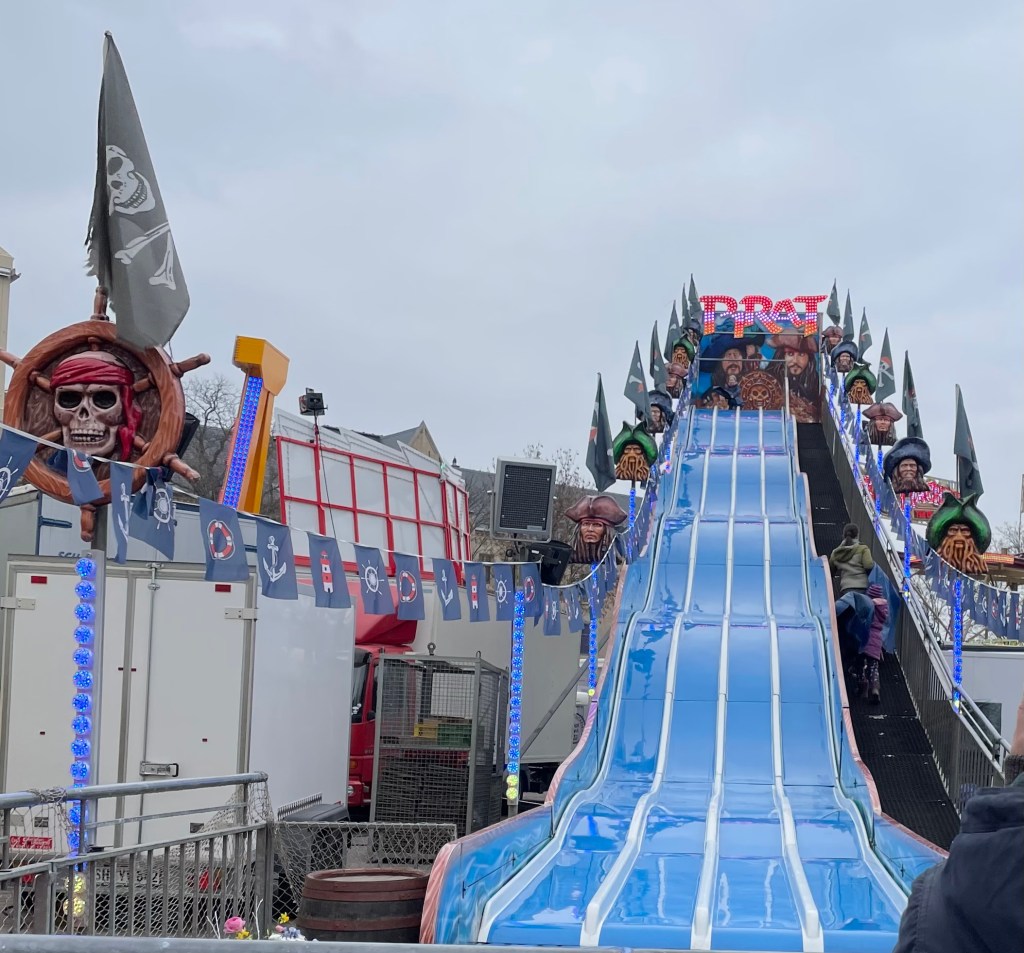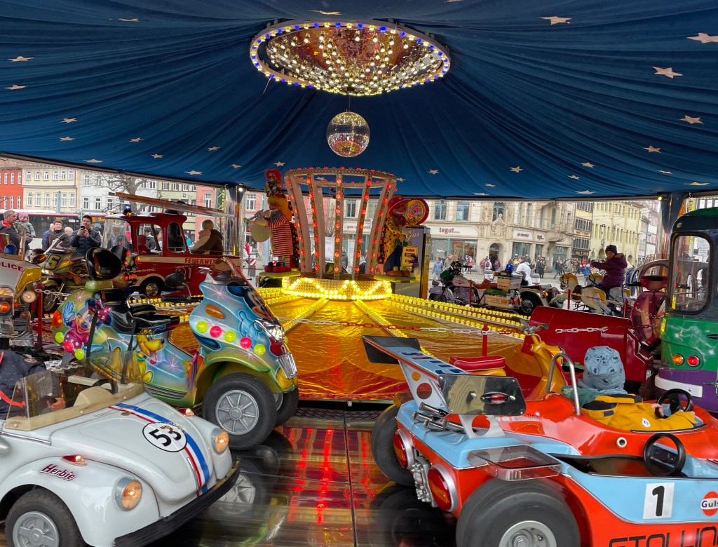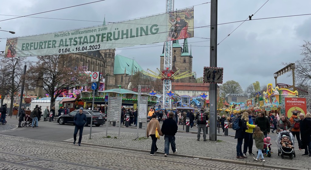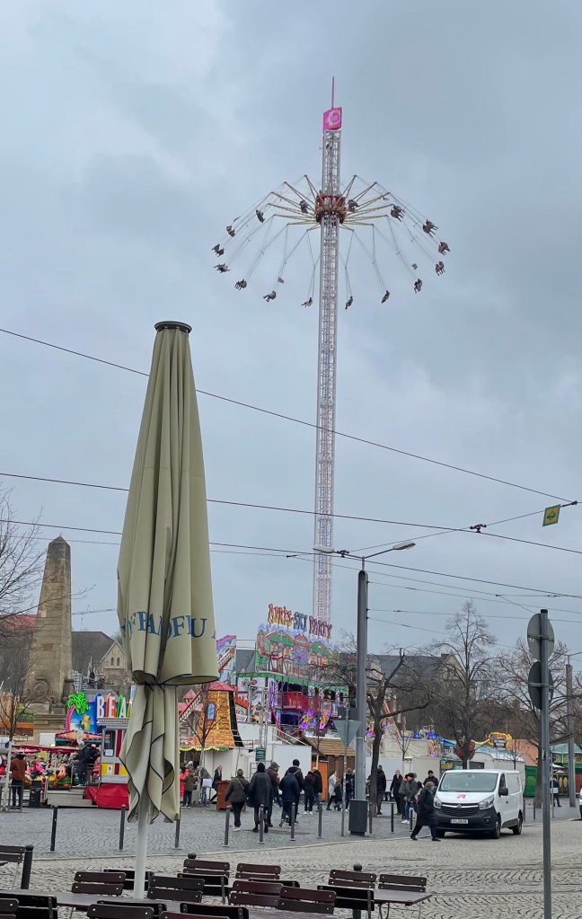 Bevor wir uns nachmittags mit der Straßenbahn auf den Weg zum Altstadtfrühling auf dem Domplatz machten, futterten L und ich je ein Stück des Marmorkuchens. Wurden wir vor einem halben Jahr auf dem Rummel noch mit Kuscheltieren überhäuft, fielen die Gewinne diesmal an jedem Stand eher mager aus. L traf beispielsweise sechs Luftballons von zehn möglichen und erhielt als Preis irgendeinen Schnulli, der sogar im Laufe des Abends noch kaputtging.