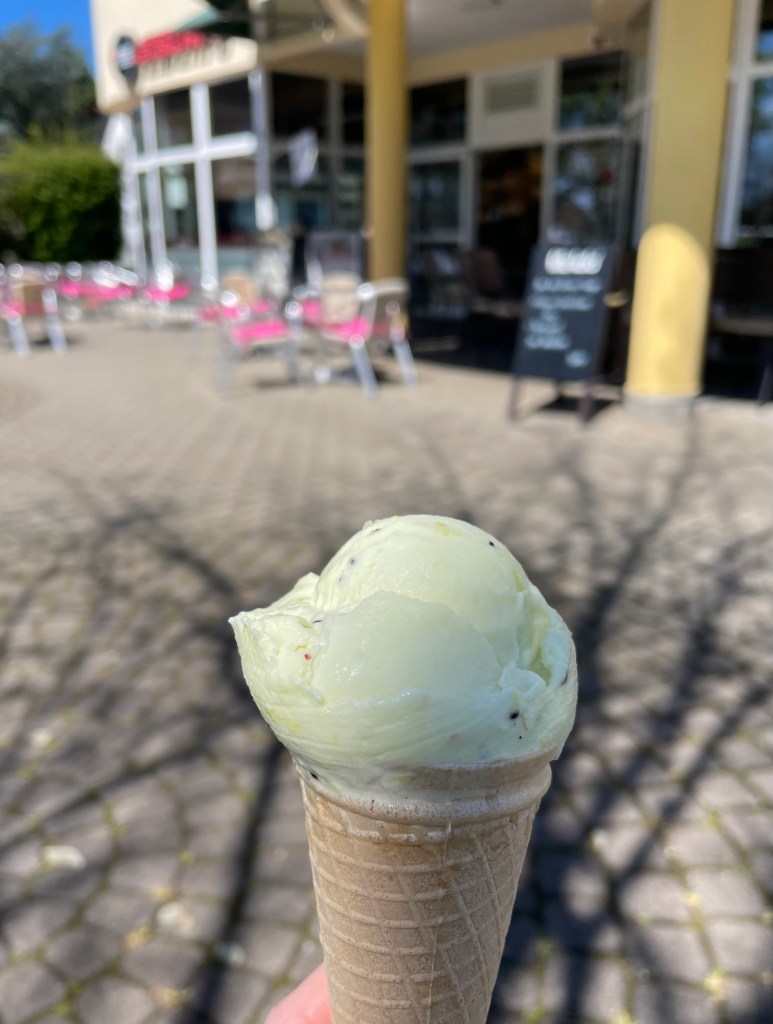 Da L ihren Roller dabeihatte, stimmte sie einem kleinen Spaziergang im Sonnenschein zu. Dieser endete rein zufällig vor der Eisdiele. Jede von uns holte sich eine Kugel Kiwieis, die unglaublich lecker schmeckte.