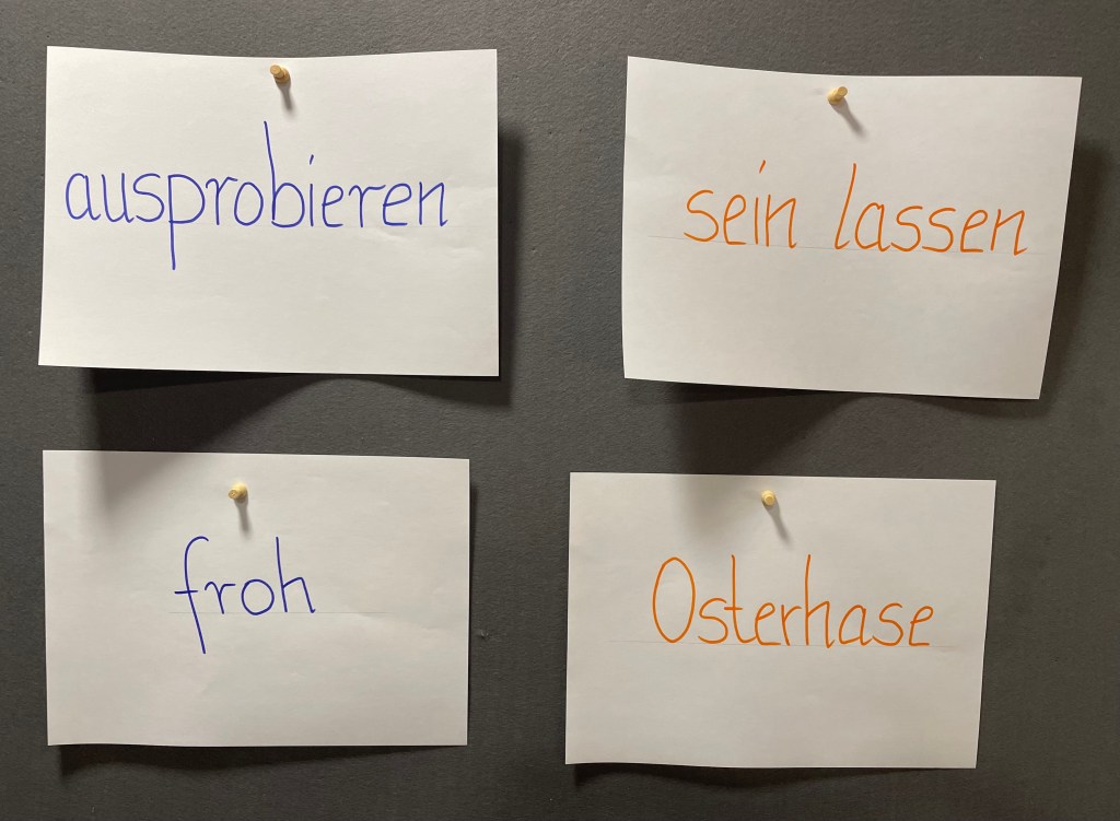 Mit einer von mir klar formulierten Ansage direkt zu Anfang der Retro, dass diese eine Stunde bitte aufmerksam zugehört und mitgearbeitet werden soll und „wichtige“ Arbeits-E-Mails im Anschluss immer noch gelesen und beantwortet werden können, startete heute nach dem Mittagessen das Meeting zum Sprintabschluss. Diese dritte Retro in Person vor Ort im Büro war wirklich sehr schön, zielführend und produktiv – zumindest meinem Gefühl nach. Das Team sollte unter anderem eine kleine Geschichte über den letzten Sprint schreiben und dabei alle auf dem Bild ersichtlichen Begriffe mindestens einmal verwenden. Es kamen interessante Stories dabei heraus.