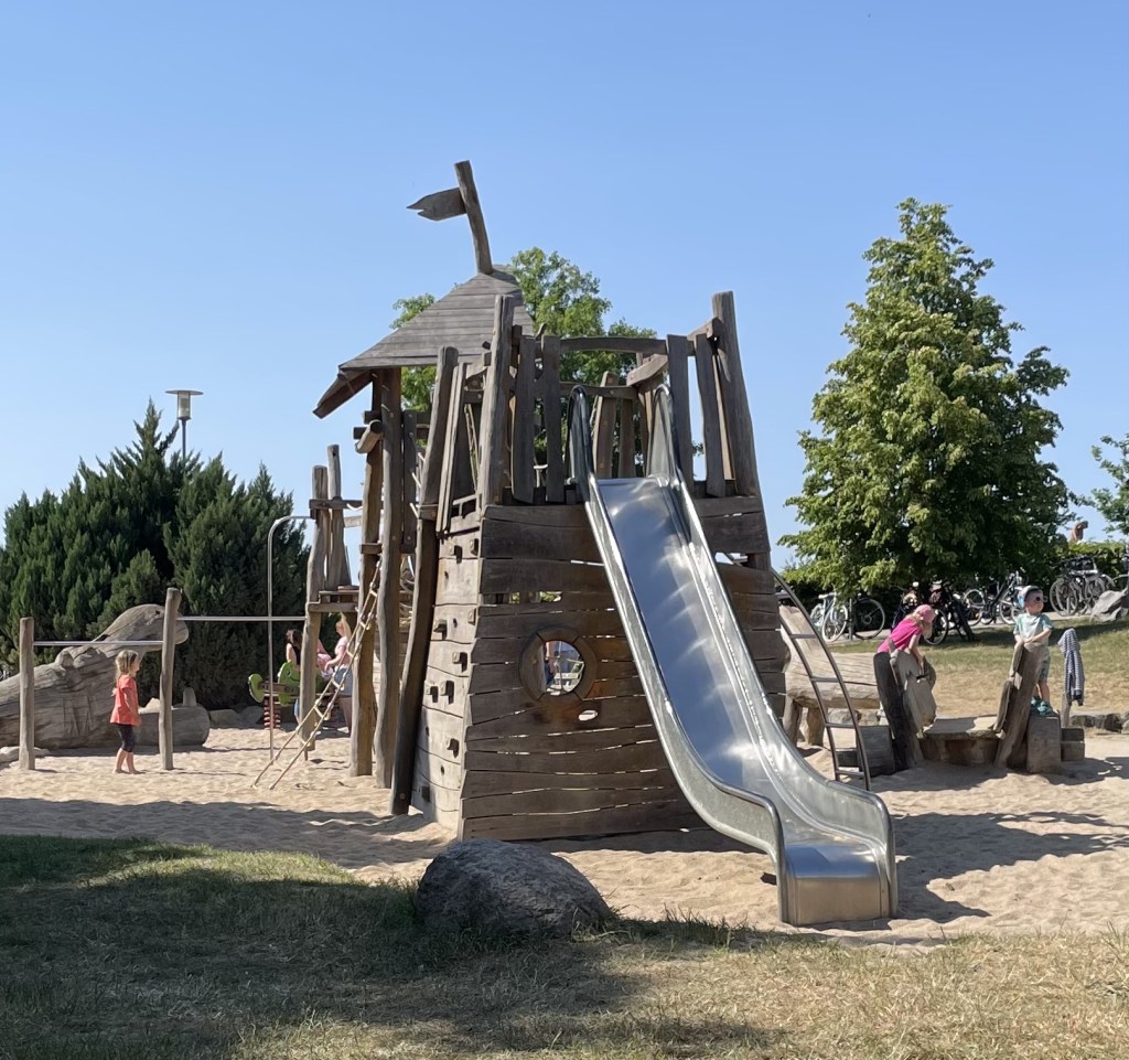 Den für heute geplanten Kinobesuch ersetzten wir durch einen mehrstündigen Aufenthalt am Cospudener See. Wir fuhren mit den Fahrrädern hin und zurück. Wir hatten genug Zeit, um uns zu sonnen, den Ausblick zu genießen und die Füße im Sand zu wärmen. L und ich waren sogar zweimal im See baden. Das Wasser war zwar noch ziemlich kalt, aber zumindest bereits so angenehm, dass wir nach kurzer Überwindung darin schwammen. Ein Eis für jede und lange Aufenthalte auf zwei Spielplätzen durften heute auch nicht fehlen.