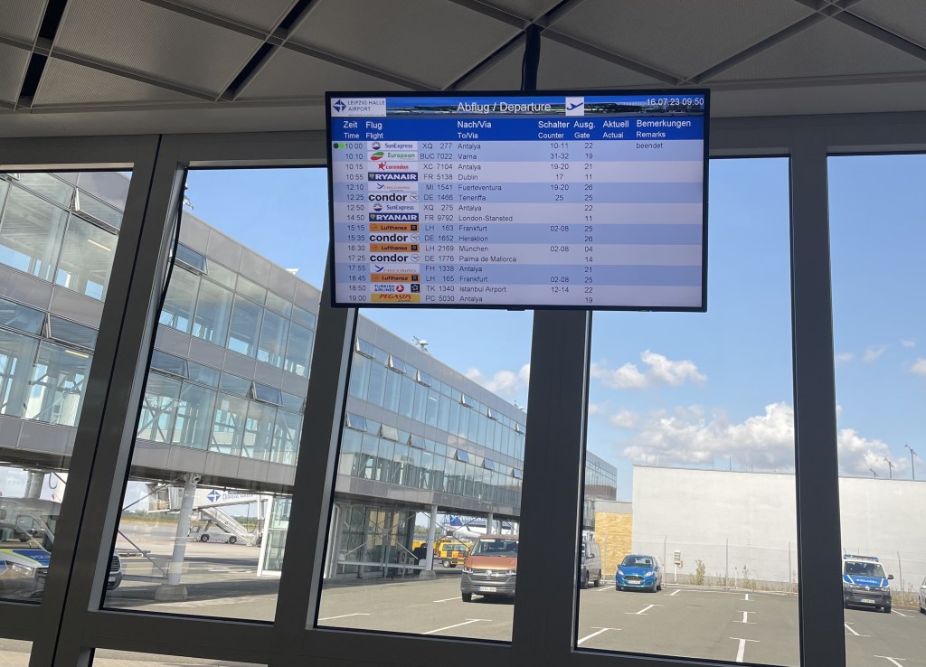 Die Linie 5 brachte L und mich in einer halben Stunde zum Flughafen Leipzig/Halle.