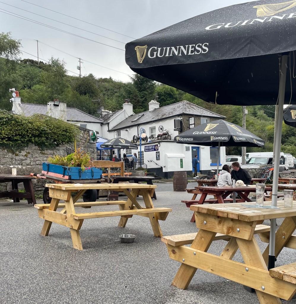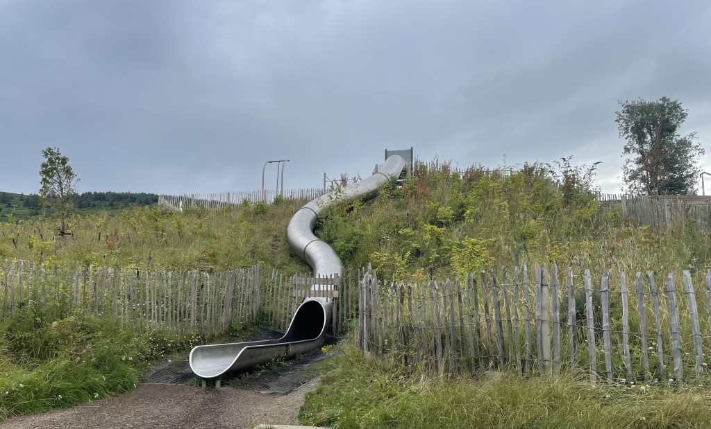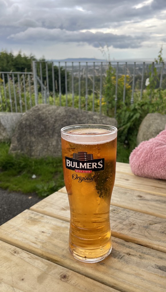 Mit Wechsel aus Regenschauer und Sonnenschein spazierten wir am Nachmittag (bei herbstlichen Temperaturen) zu einer großen Rutsche und liefen kurz darauf weiter zum Pub „The Blue Light“. Dort gab es Live Musik, ein Bulmers für mich und Pizza, Pommes und Chips ohne Ende für uns alle. Pure Völlerei quasi.