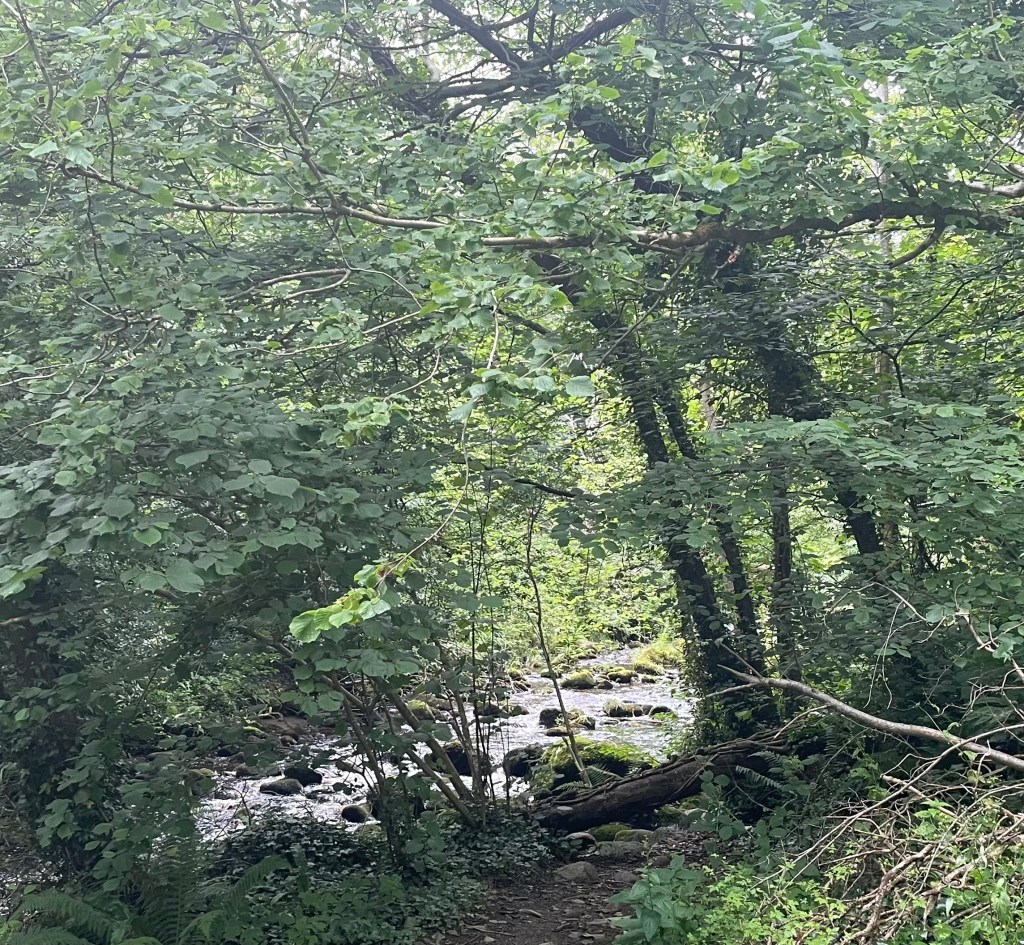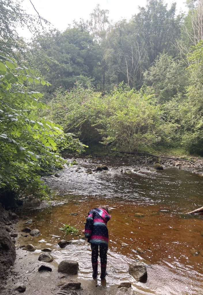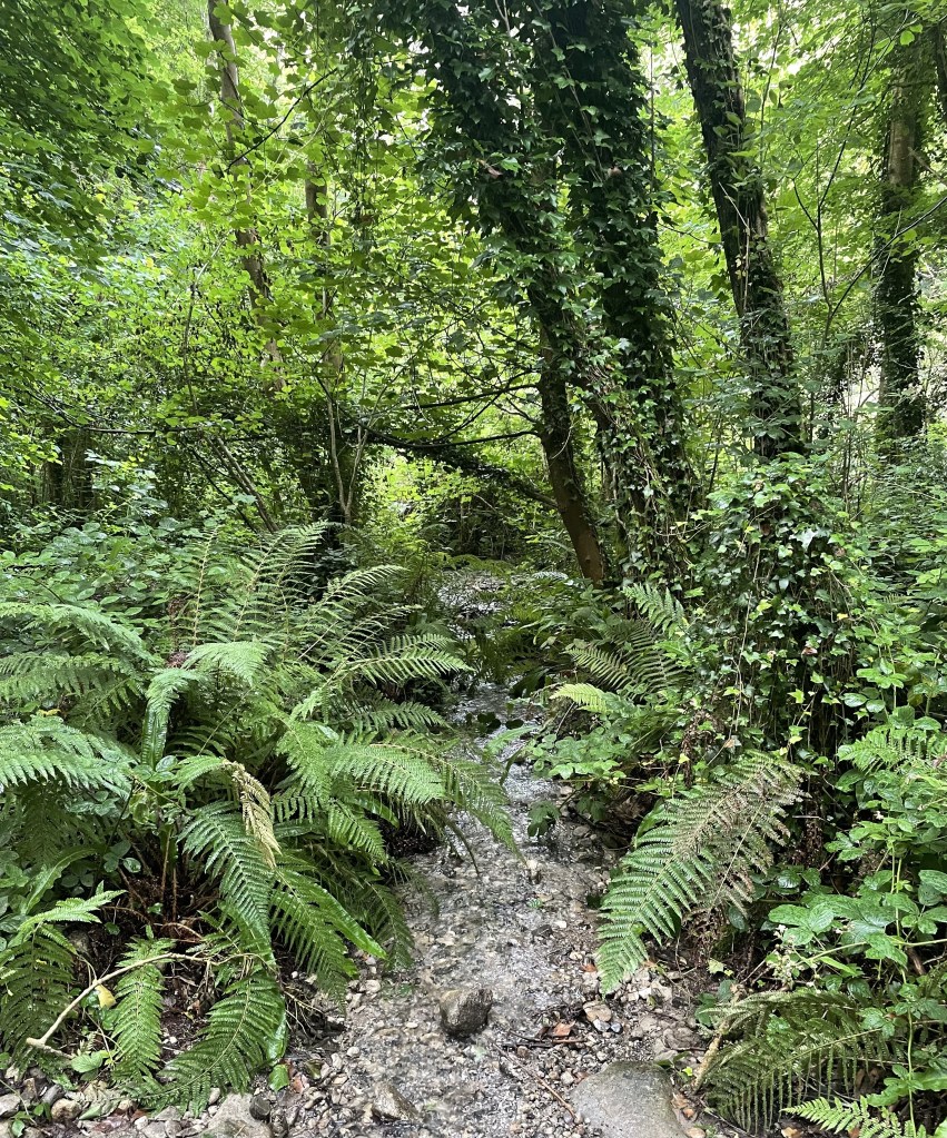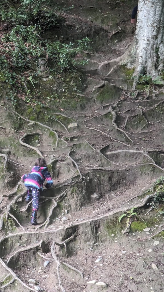 Der Knocksink Wood, den wir anschließend besuchten, war so unfassbar grün und dicht bewachsen, dass ich gar nicht mehr aufhören wollte, Fotos zu machen. Der Fluss enthielt Katzengold (Pyrit) und schimmerte (vermutlich wegen eines hohen Eisengehalts) rötlich. L und J wateten ein wenig durch ihn hindurch, J barfuß und L in ihren Gummistiefeln. Gegen Ende des Weges kletterten die Kinder noch einen sehr steilen Hügel hinauf.