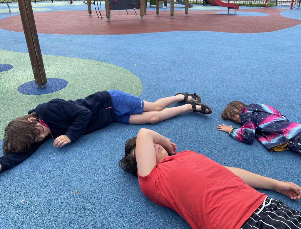 Nach meiner Morgendusche und einem Kornflakes-Frühstück machten sich S und R für ein paar Stunden auf den Weg zur Arbeit. Ich blieb mit den drei Kindern L, J und T daheim.