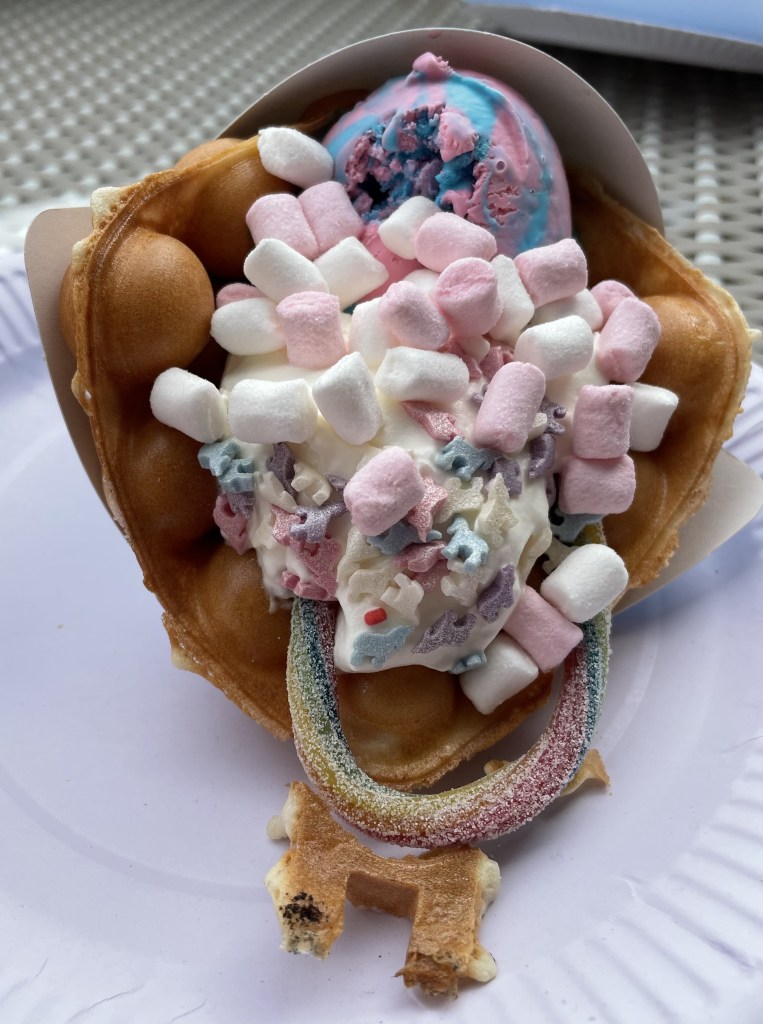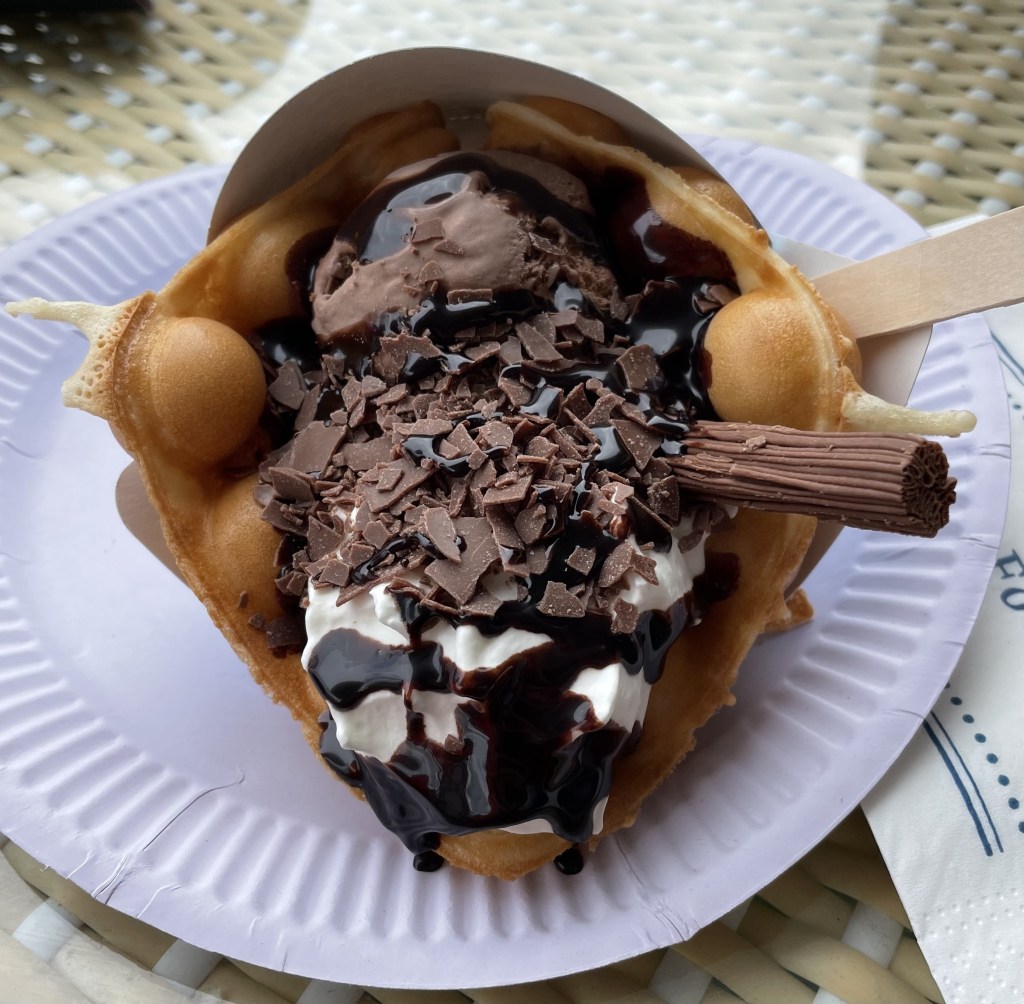 Nachmittags waren S und R wieder zurück und wir machten uns allesamt auf den Weg in Richtung Ts und Js Schule. Dort gibt es in der Nähe nämlich einen Bubble Waffle Shop. Ich wollte unbedingt eine Waffel essen und entschied mich für „Death by Chocolate“, während L eine „Unicorn Magic“ futterte.