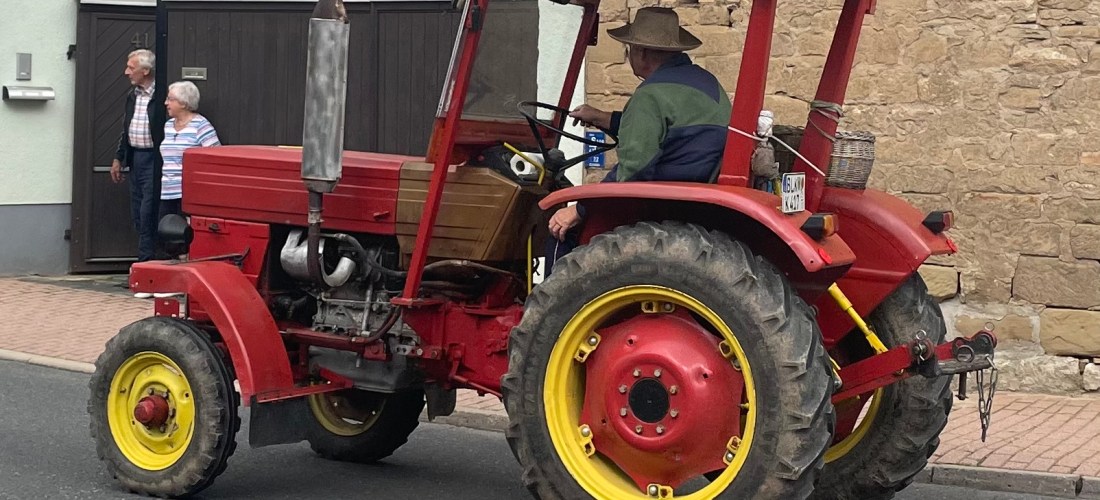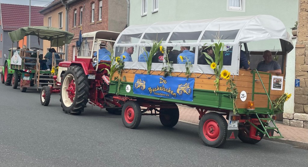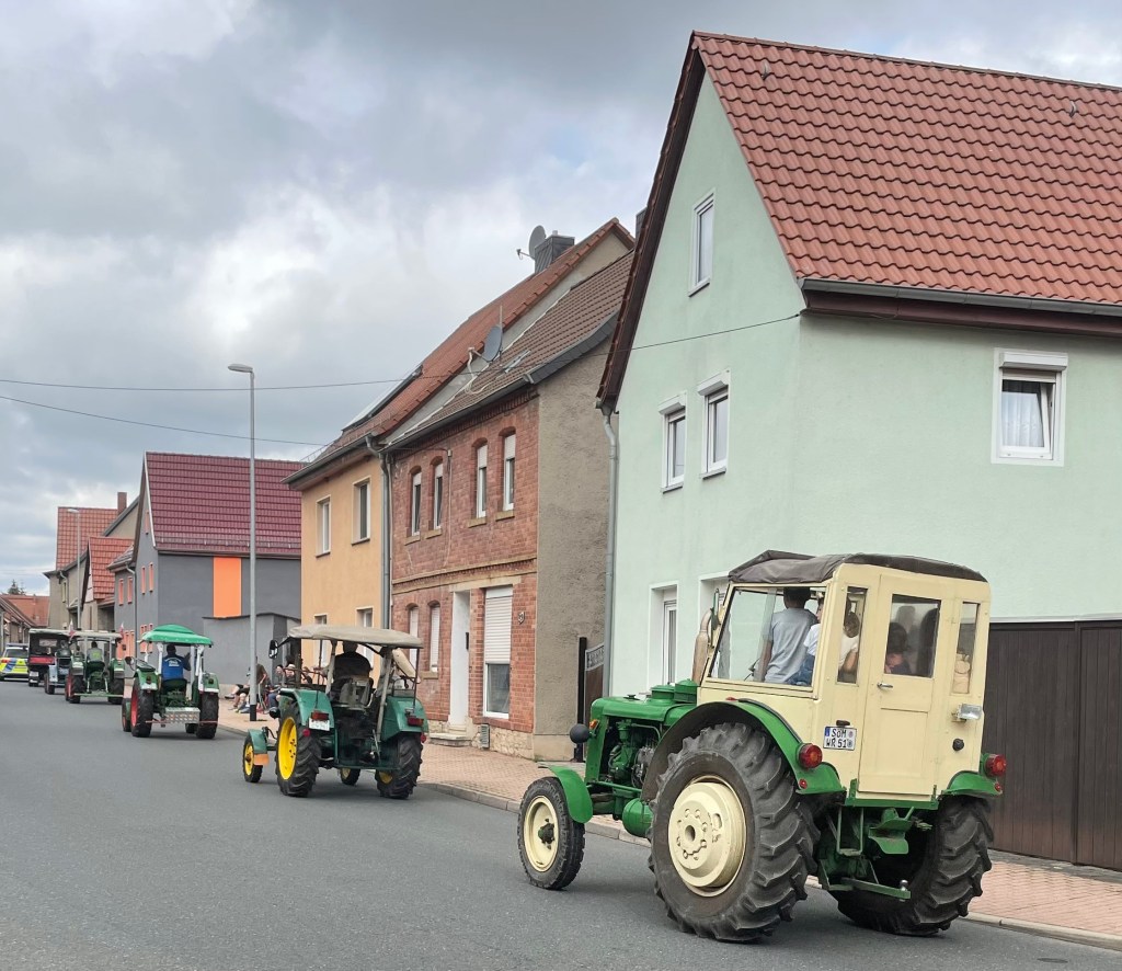 Als wir fünfundsiebzig Minuten später beim Haus von Y und seinen Eltern K und X ankamen, war zu Ls großer Freude auch ihr ehemaliger Kindergartenfreund K mit seinem Papa da. Gemeinsam schauten wir uns den Traktorumzug durch das Dorf an.