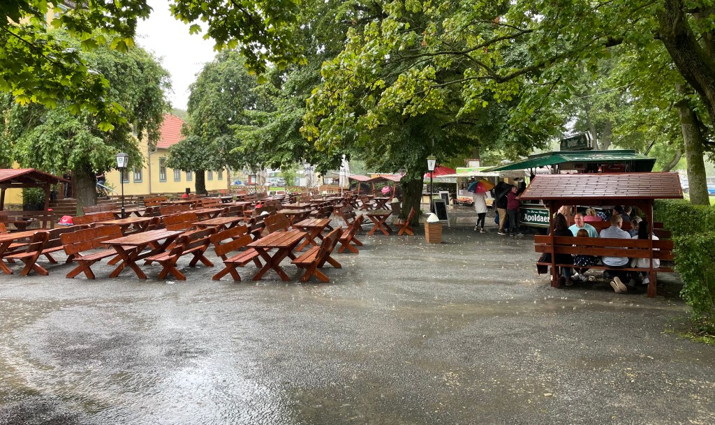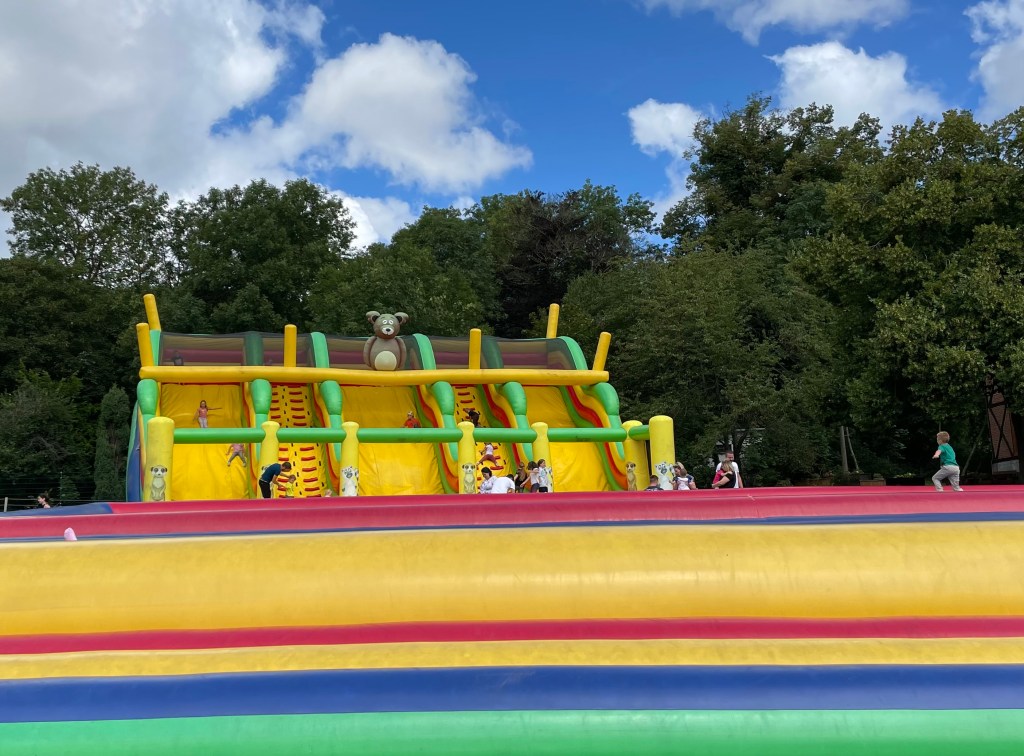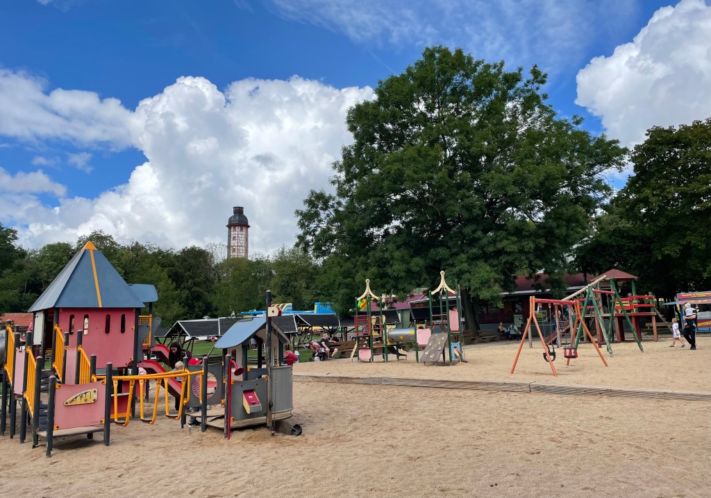 Am späten Vormittag fuhren wir mit dem Auto zum Freizeit- und Erholungspark Possen. L durfte sich dort auf den Hüpfburgen und im Kinderkletterwald austoben, während meine Schwiegermama und ich permanent damit beschäftigt waren, die Jacken aufgrund des sehr wechselhaften Wetters an- und wieder auszuziehen. Ein paar Tieren statteten wir ebenfalls einen Besuch ab. Wir hatten etwa dreieinhalb Stunden inklusive eines leckeren Mittagessens im Außenbereich Glück mit dem Wetter, ehe es sich zuzog und sehr starker Platzregen und Gewitter einsetzte.