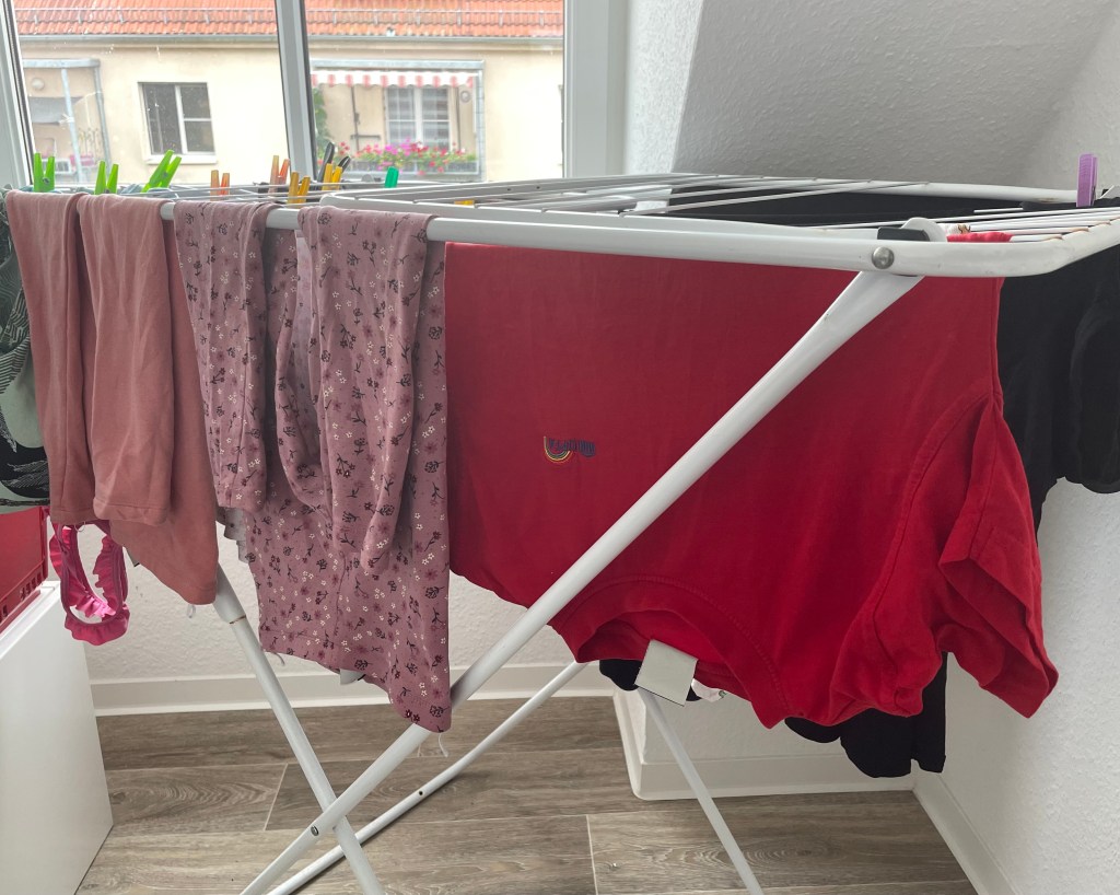 Nach einem entspannten Restefrühstück mit einer Tasse leckeren Schokocappuccinos piepte die Waschmaschine, um mir zu signalisieren, dass die Wäsche sauber ist. Ich hing die wenigen Kleidungsstücke von L und mir auf den Wäscheständer und machte mir damit eine kleine Freude für unsere Urlaubsrückkehr am 20. August.