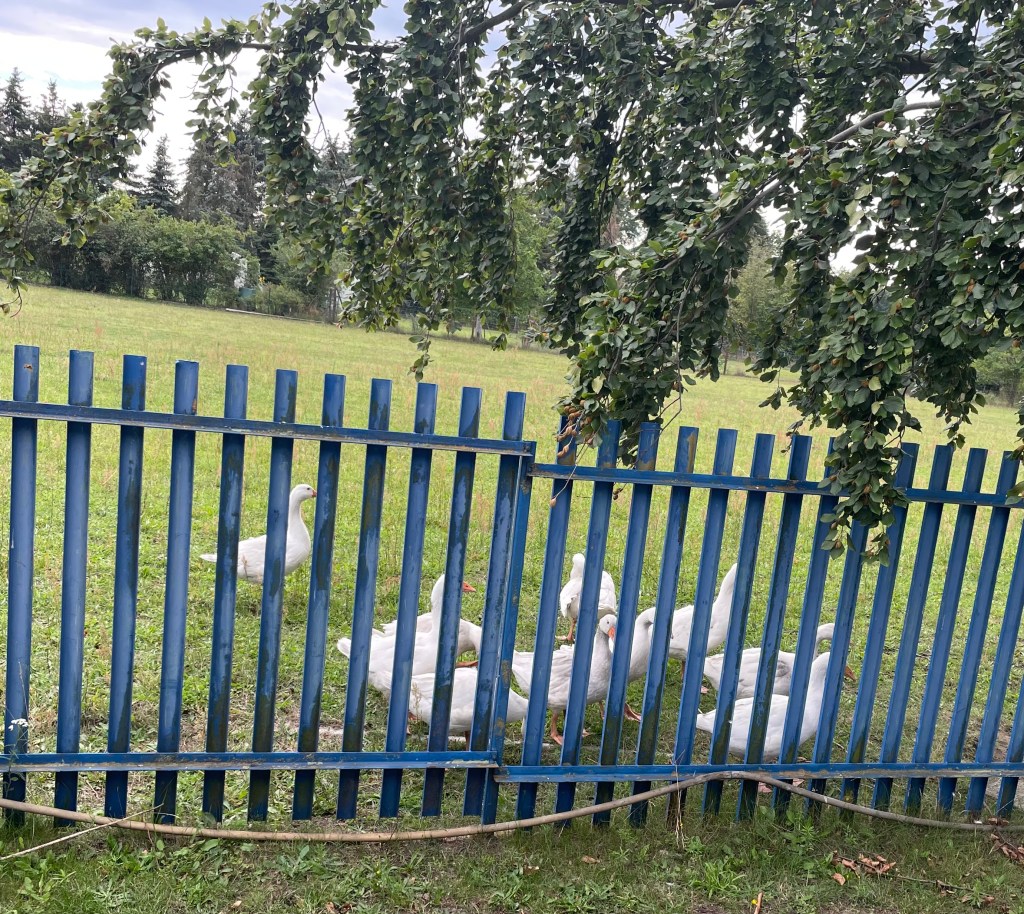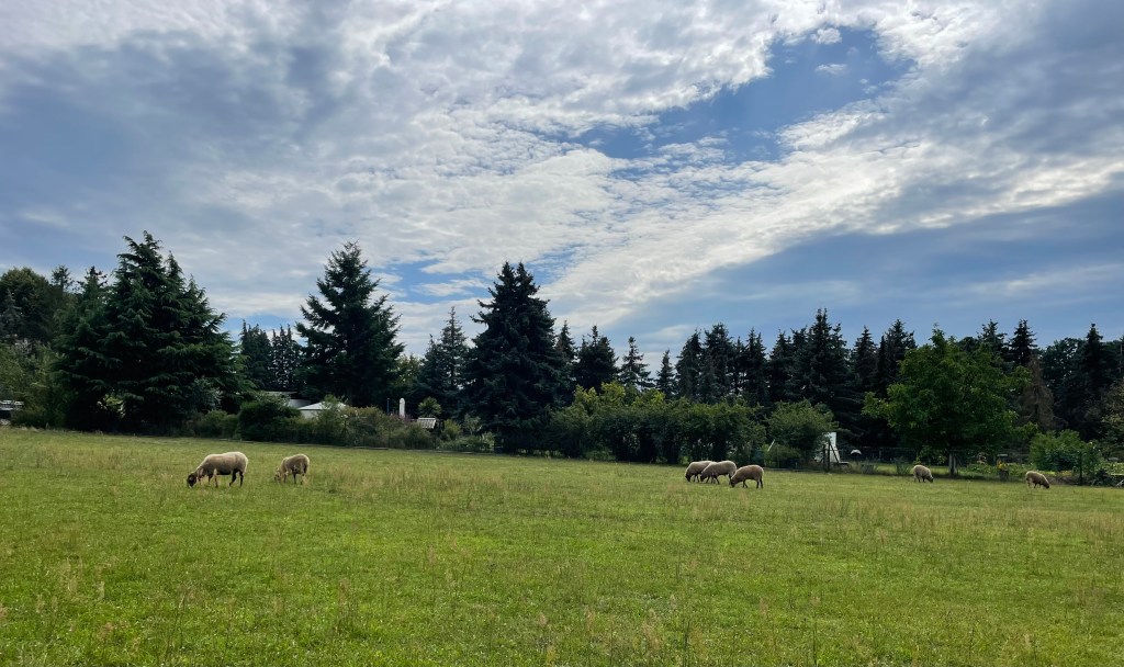 Während ich es mir im Liegestuhl auf der großen Terrasse mit einem Buch bequem machte und L mit ihren Playmobil Figuren spielte, merkte ich, wie mein Blick immer wieder zu den Tieren hinter dem drei Meter entfernten Zaun huschte. Es machte so viel Freude, den Schafen, Gänsen und Truthennen beim Fressen, Spielen und Schnattern zuzuschauen.