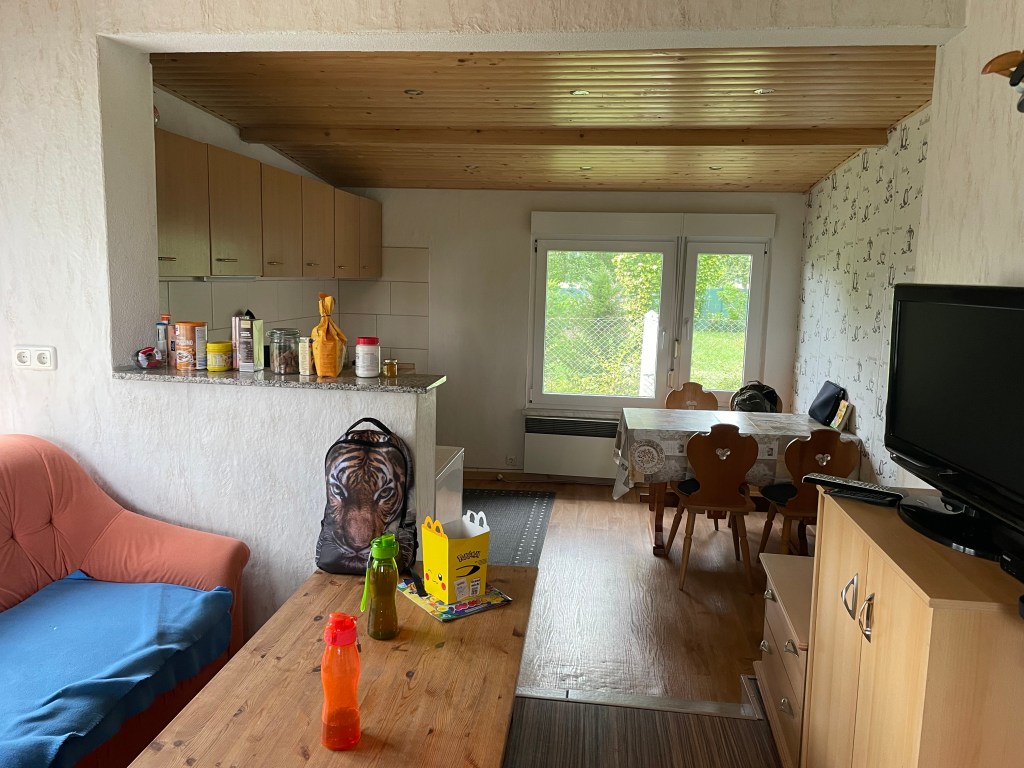 In diesem Jahr bewohnen L und ich den größeren der beiden Bungalows, die sich in dem Ort Hohenbocka befinden. Der kleinere Bungalow wurde an eine Frau, die Hunde betreut, dauervermietet. Ab und an läuft in dem großen Garten ein kleiner lieber Wuschelhund herum.