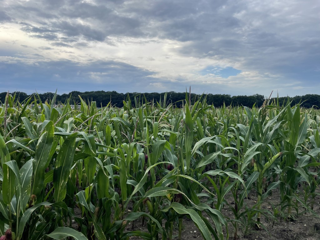 Direkt vor unserer Nase befindet sich ein großes Maisfeld. Wegen aufziehender Gewitterwolken verschoben L und ich unseren Spaziergang durch das Dorf auf morgen.