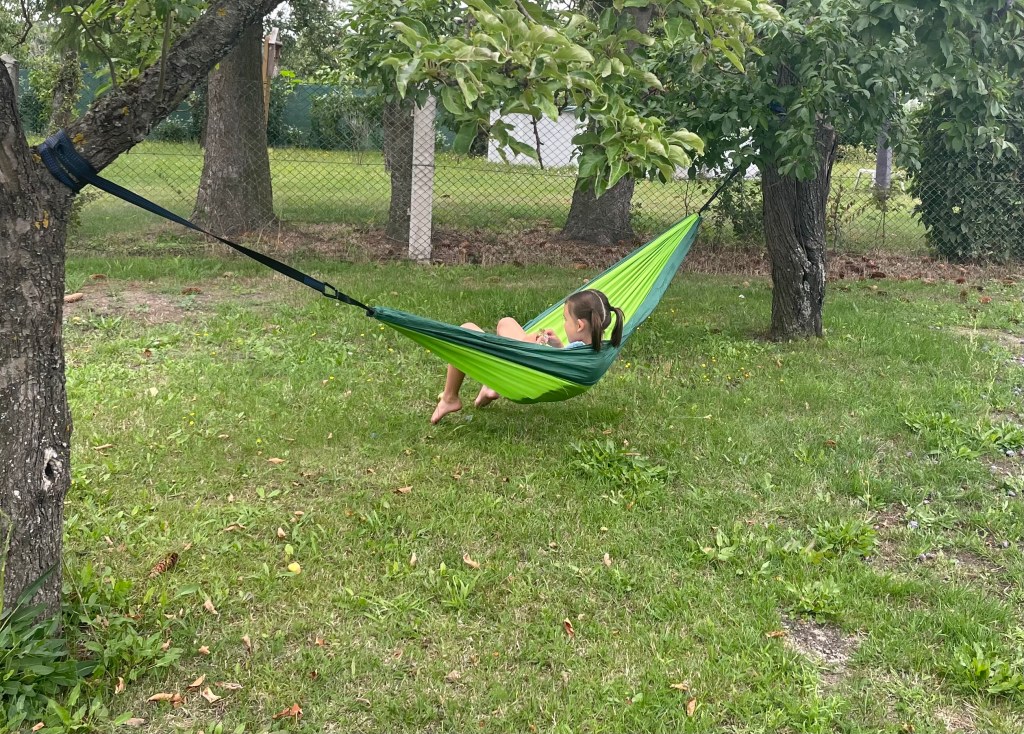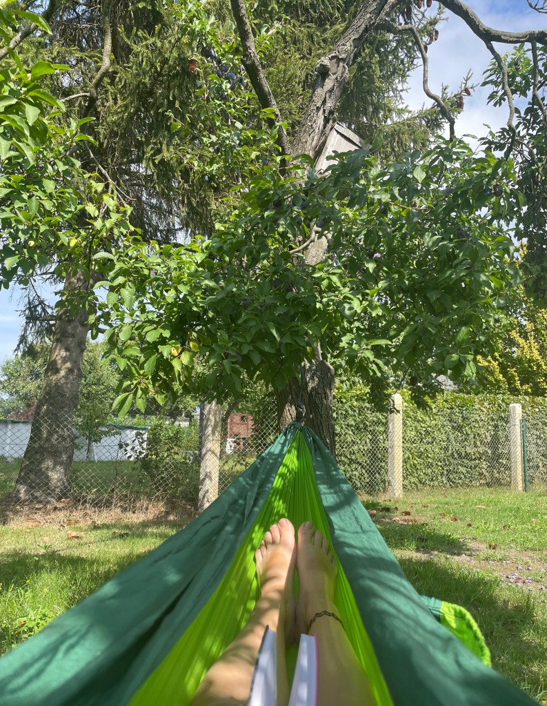 – Lesen in der Hängematte unter einem Apfel- und Pflaumenbaum
