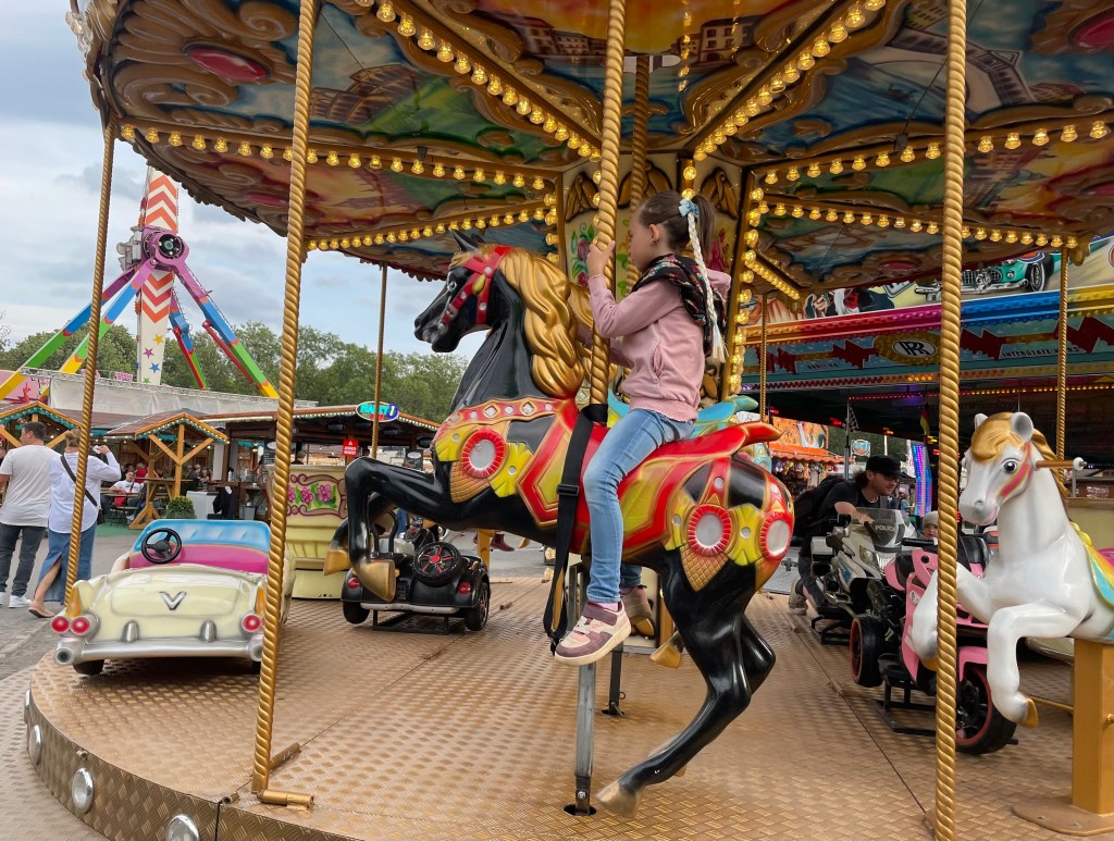 Nachmittags besuchten L und ich die Leipziger Herbstmesse. Wir fuhren zusammen zweimal mit der Achterbahn und kauften ein paar Lose bei der Losbude. L durfte noch zweimal Karussell fahren und ihr Glück mit den Dartpfeilen und den Luftballons versuchen. Mit einigen Süßigkeiten verließen wir anderthalb Stunden später den Jahrmarkt.