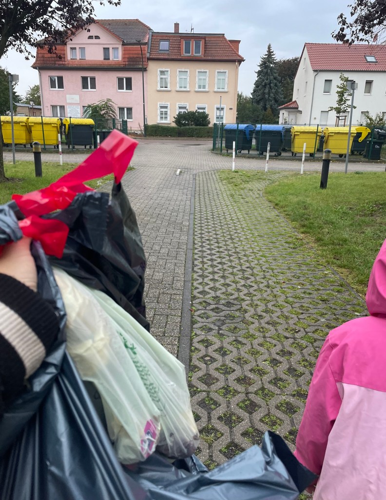 Da wir ein paar Tage nicht zu Hause sein werden, brachten wir zuerst die Müllbeutel zu den Mülltonnen.