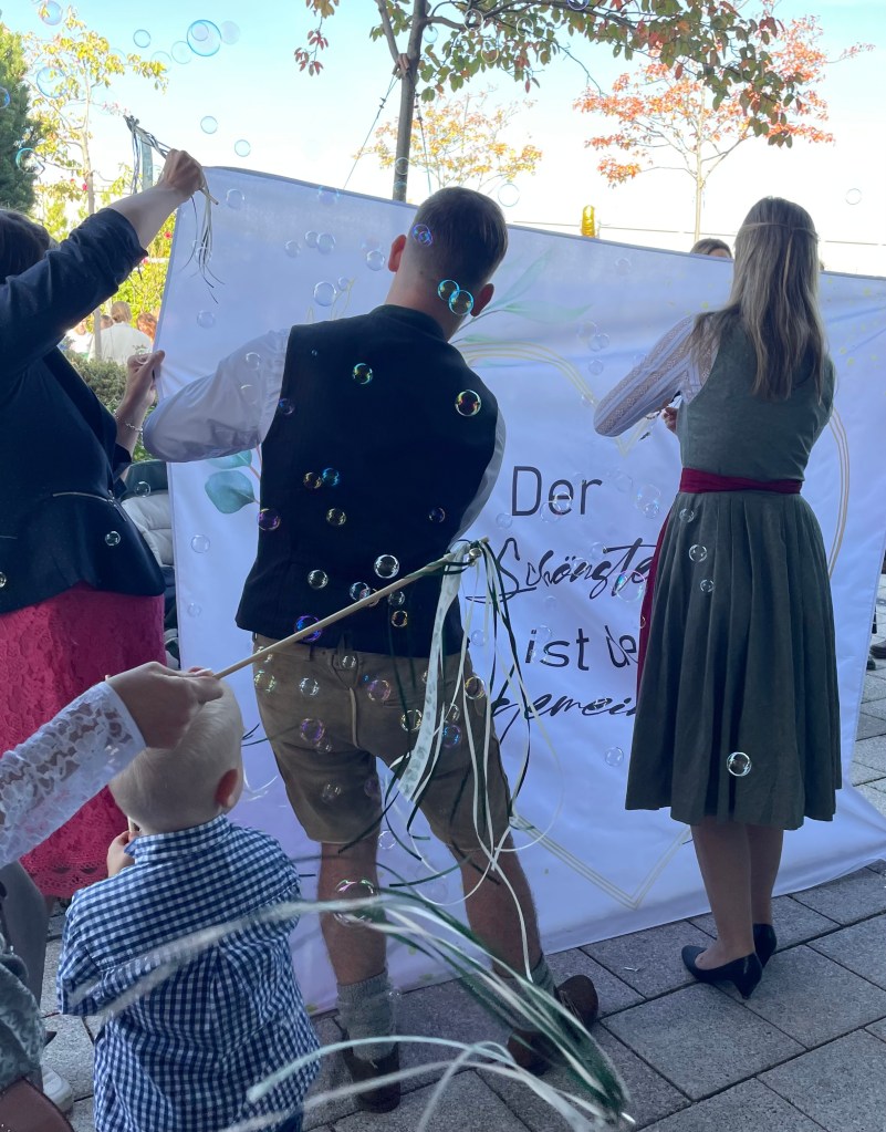 Nach der kurzen, aber sehr schönen Trauung begaben sich alle Gäste und einige neu hinzu gekommene Arbeitskolleginnen und -kollegen auf die zum Standesamt gehörende Dachterrasse zum Sektempfang und Bejubeln des frisch vermählten Brautpaares. Mein Bruder und J durften ein großes Herz ausschneiden und wurden von Seifenblasen eingehüllt, da das Werfen von Blumenblüten oder Reiskörnern nicht gestattet war.