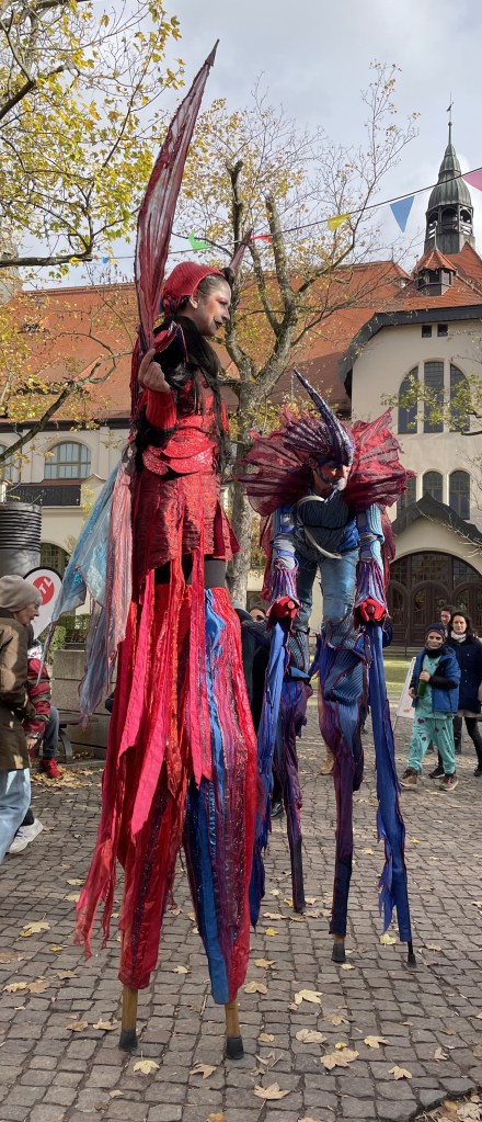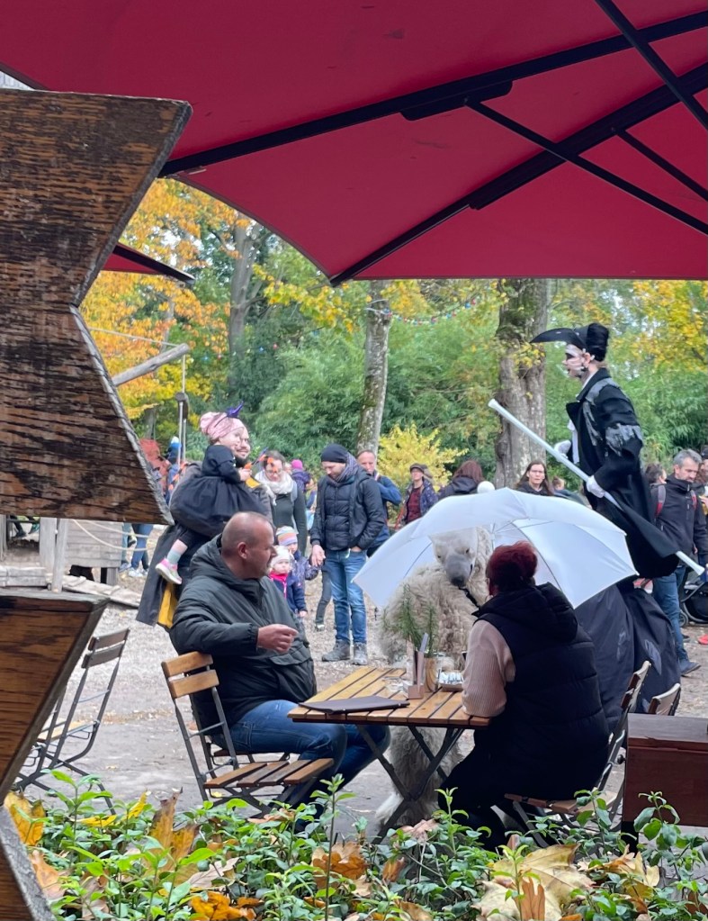 Halb elf verließen L und ich mit ihrem Halloweenkostüm die Wohnung und fuhren ausnahmsweise mit dem Auto in Richtung des Leipziger Zooparks. Wir fanden problemlos einen Parkplatz und trafen wenig später Ls Schulfreundin L, ihren kleinen Bruder J und die Mama M. Da Ls Halloweenkostüm noch im Auto lag und sich abzeichnete, dass das Kind ohne dieses nicht glücklich sein und Spaß haben würde, lief ich zurück und holte es ihr. Im gesamten Zoopark wurde Halloween gefeiert. Es gab viele zusätzliche Stände, Unterhaltung für die Kinder und tolle Mitmachaktionen.