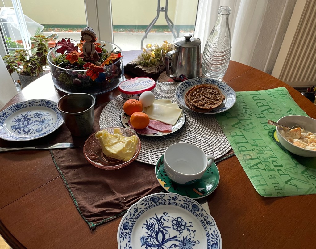 Halb zehn trafen wir drei uns am gedeckten Frühstückstisch …
