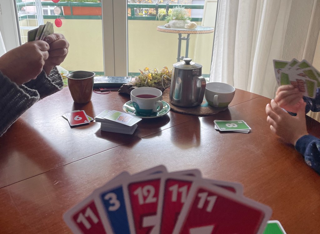 … und spielten anschließend eine Runde Skip-Bo, bei der L gewann, und danach etwa fünf Minuten lang das mir bis dato unbekannte Spiel „Malefiz“. Aus einem M und mir unbekannten Grund hatte L plötzlich schlechte Laune und wollte die Spielregeln nicht akzeptieren. Als L letztendlich wutschnaubend das Wohnzimmer verließ und Türen knallte, erklärten wir den Spielevormittag für beendet.