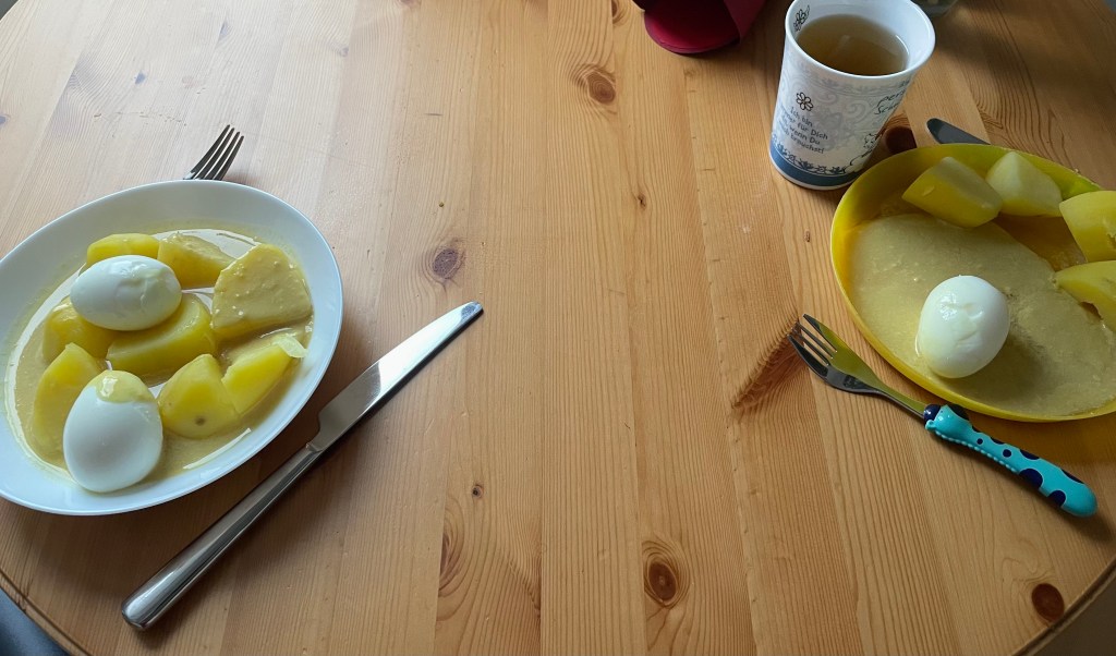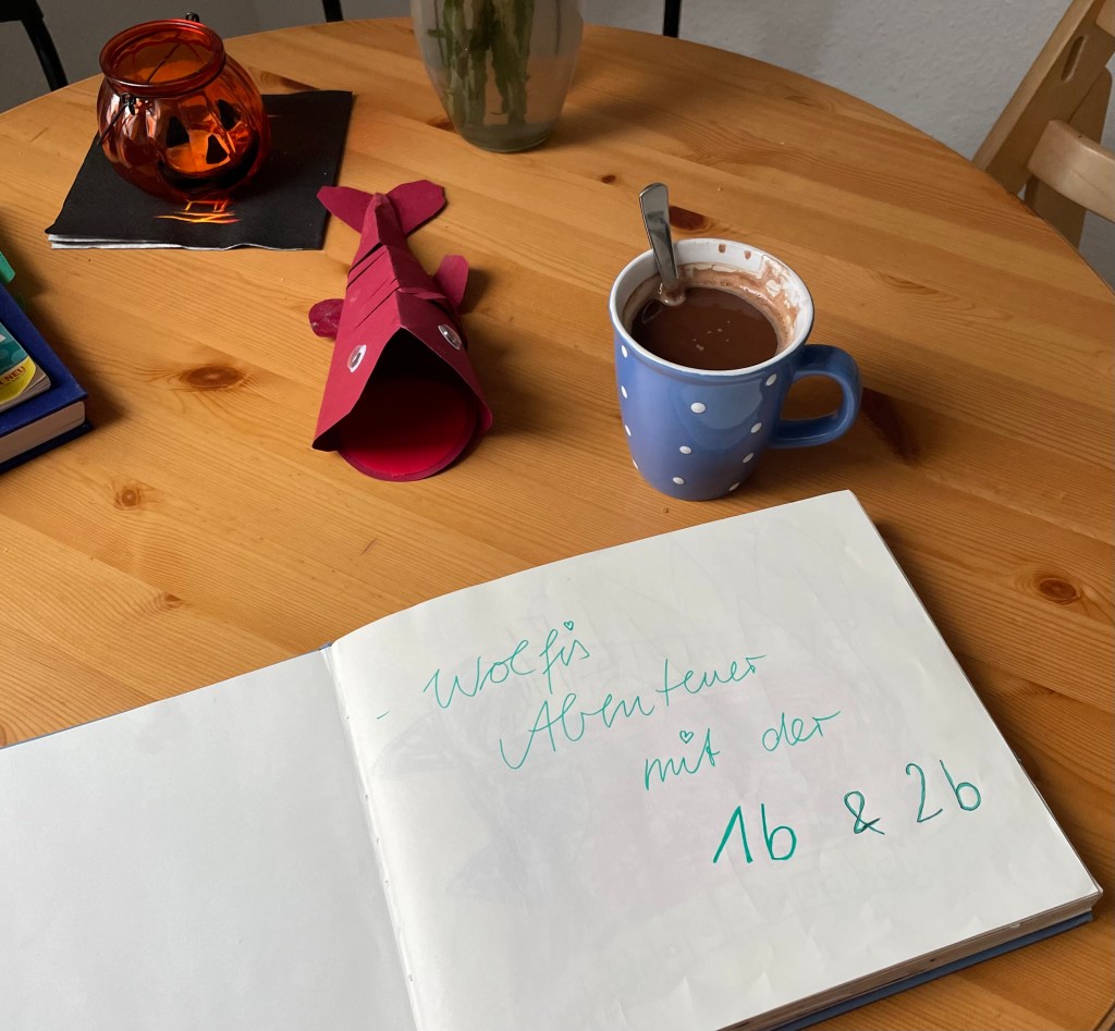 Wieder zu Hause angekommen, kochte ich mir eine Tasse meines geliebten Schokocappuccinos sowie eine große Kanne Salbeitee, schaute mir die bisherigen Einträge in Wolfis Abenteuerbuch an, kochte Kartoffeln und Eier und bereitete eine Senfsoße zu. (Auf dieses Gericht hatte ich irgendwie seit der Autofahrt großen Appetit.)