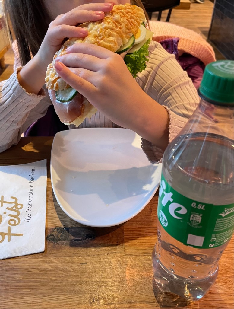 Im Sitzbereich der Bäckerei Feist machten L und ich schließlich eine kleine Pause von unserer Shoppingtour und aßen und tranken eine Kleinigkeit.