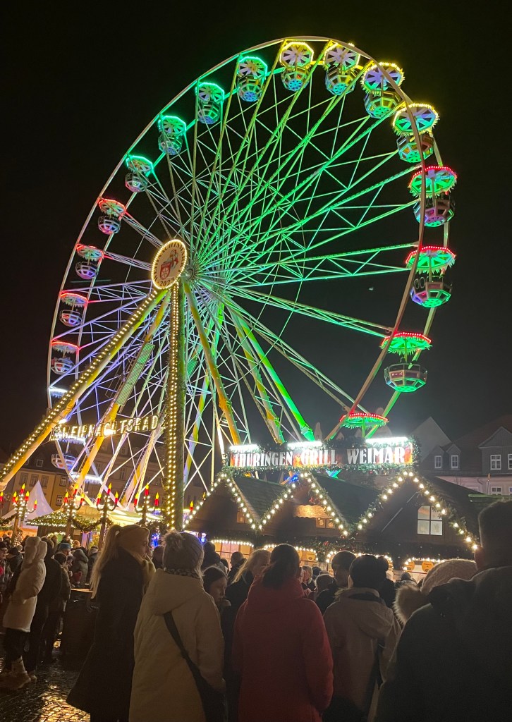 Kurz nach siebzehn Uhr zogen wir los in Richtung Domplatz zum Erfurter Weihnachtsmarkt. Dort standen wir bei ein oder zwei Tassen Glühwein oder Kinderpunsch in der Nähe des Riesenrades und unterhielten uns in kleineren Gruppen über verschiedenste private Themen.