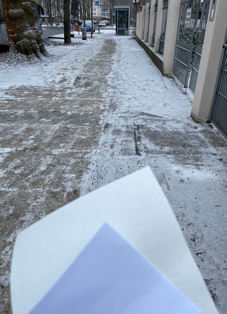 Nach einem neuen Rekord in der Kategorie „Welches Schulkind verlässt morgens die Wohnung zuletzt“ stellten L und ich beim Öffnen der Haustür fest, dass außer uns und dem Nachbarshund mit seinem Frauchen noch niemand draußen war. Wir hinterließen somit mit die ersten Spuren im frisch gefallenen Schnee.