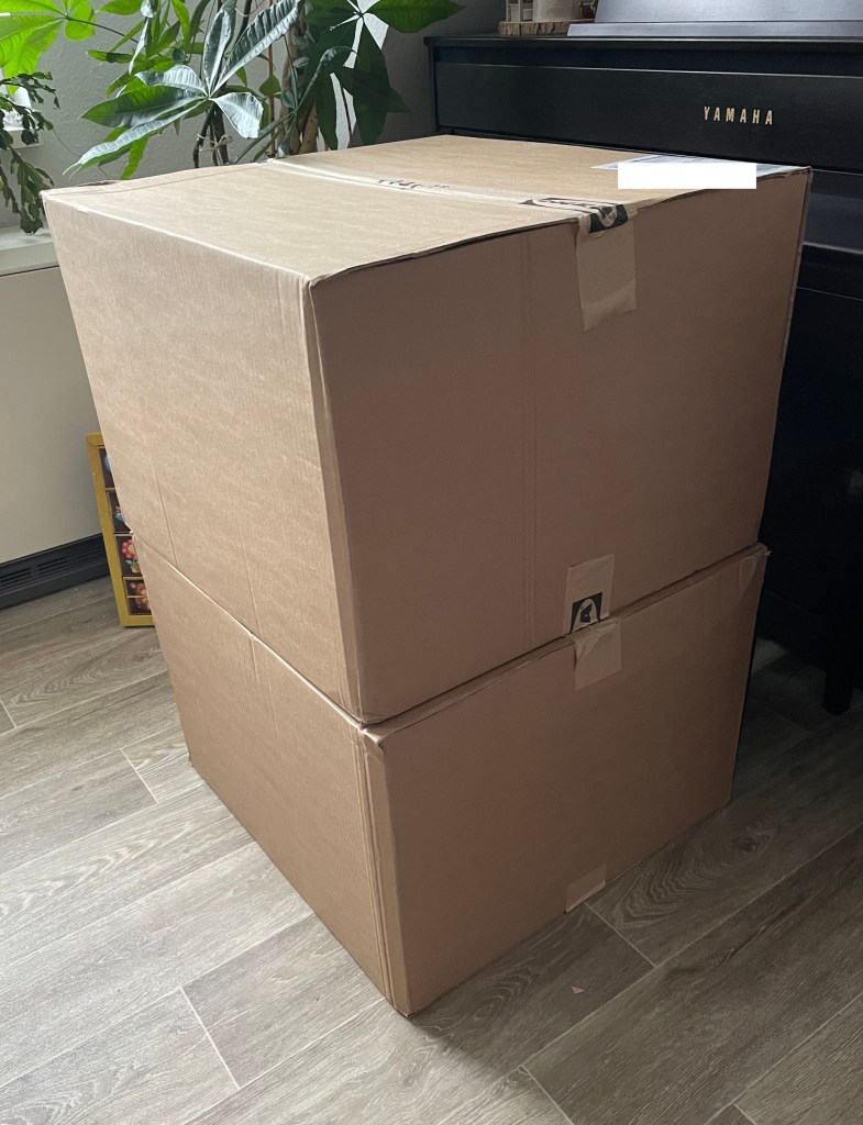 Auch zum Öffnen dieser zwei IKEA-Pakete, die am Montag geliefert wurden, hatte ich noch keine Zeit und/oder Kraft. Darin befinden sich je vier Aufbewahrungskisten mit Deckel. Ich möchte einige Bücher, die ich derzeit im Keller in Pappkartons lagere, in diese umpacken.