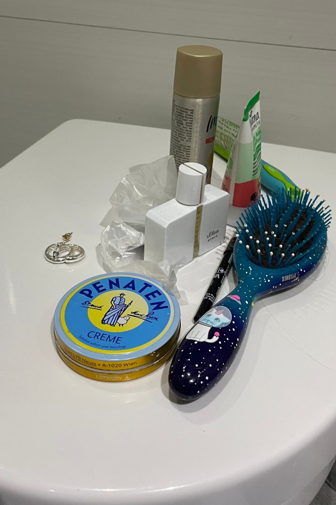 Auf dem Toilettendeckel im Bad meiner Schwiegermama breitete ich aus Ermangelung an anderen Ablageflächen die paar Utensilien, die ich morgens immer verwende, aus. Auf das Duschen verzichtete ich. Die letzten Male, als ich das Badezimmer komplett geflutet hatte, reichen mir aus.