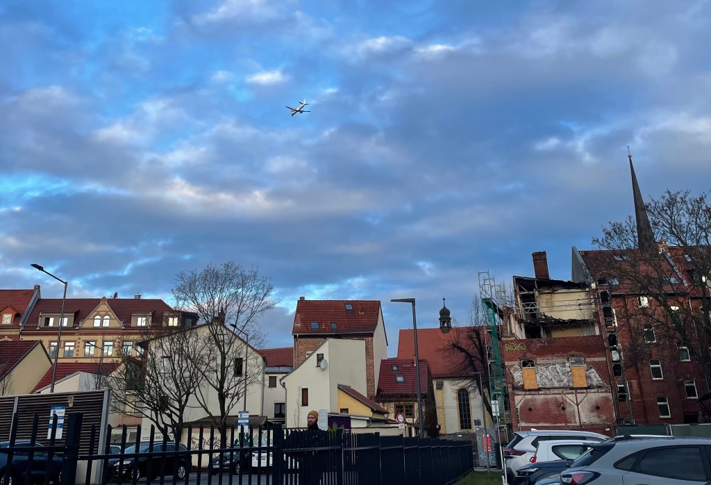 Gut gesättigt machten wir uns gemeinsam wieder auf den Weg ins Büro. Das befindet sich in der Nähe des Theaterplatzes. Links im Bild ist das Theater Erfurt zu sehen, mittig das Heizwerk und rechts ein kleiner Teil des Petersbergs.