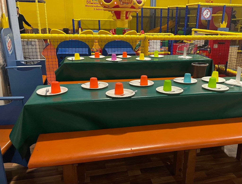 Danach begaben wir uns auf den Weg zu Ls Schulfreundin LK, die wir von zu Hause abholten. Gemeinsam fuhren wir ins Kinderland Taucha und warteten auf weitere sieben Kinder, die L zu ihrer Geburtstagsfeier eingeladen hatte. Zum Glück hatte ich diesmal einen Geburtstagstisch reserviert, denn als wir kurz nach um drei am Nachmittag den Indoorspielplatz betraten, war Einlassstopp.