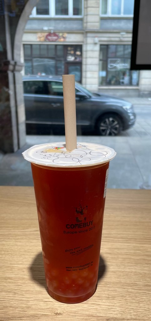 Zu viert spazierten wir mittags zum Erfurter Hauptbahnhof und kauften uns unter den Arkaden einen Bubble Tea. L suchte für uns einen koffeinfreien Rooibostee mit Erdbeer- und Litschi-Bobas aus.