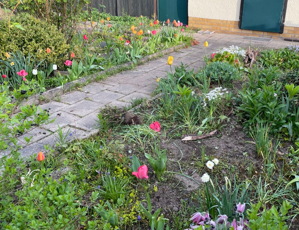 Nachdem ich L an der letzten Ampel vor der Schule verabschiedet hatte, spazierte ich ein paar Minuten lang in der Gegend umher und besuchte mal wieder die in der Nähe befindliche Kleingartenanlage. Ich mag den Blick in die Gärten sehr, vor allem, wenn die Tulpen wie hier auf dem Bild so schön blühen.