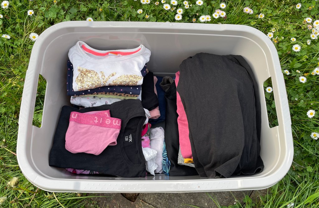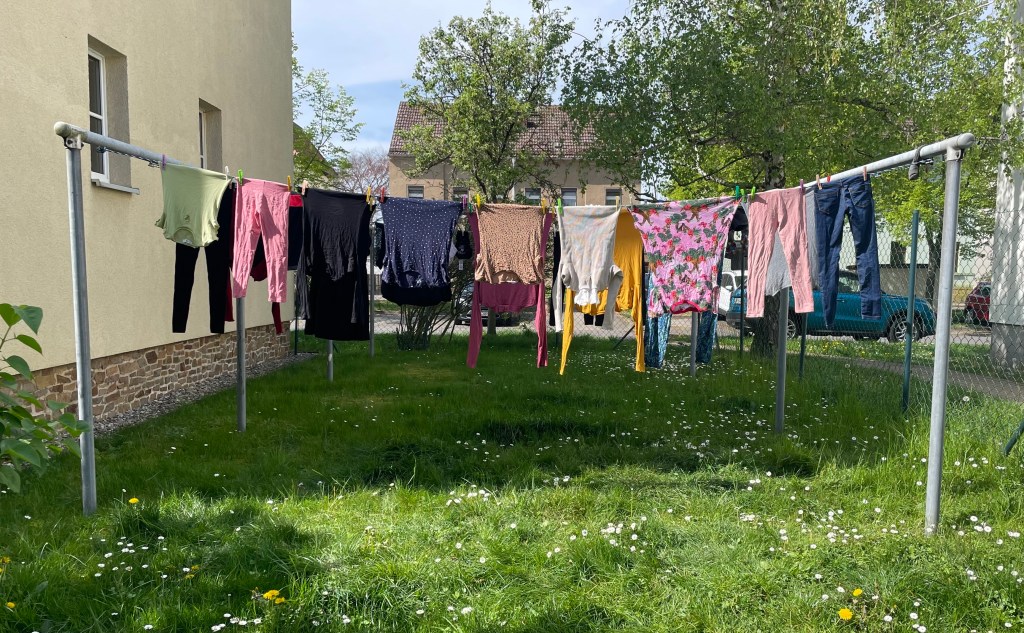 Abends fuhr L mit ihren Rollschuhen um die Häuser. Ich nahm derweil die Wäsche ab und sortierte und faltete sie direkt an Ort und Stelle. So wie ich die Wäsche im Wäschekorb nach Personen sortiere, hänge ich sie übrigens auch auf. Das erleichtert es mir im Nachhinein, Kleidung schneller zu finden. Natürlich sind L und ich nur noch zu zweit, aber auch als M noch lebte, hatte jede*r einen eigenen Platz auf dem Wäscheständer.