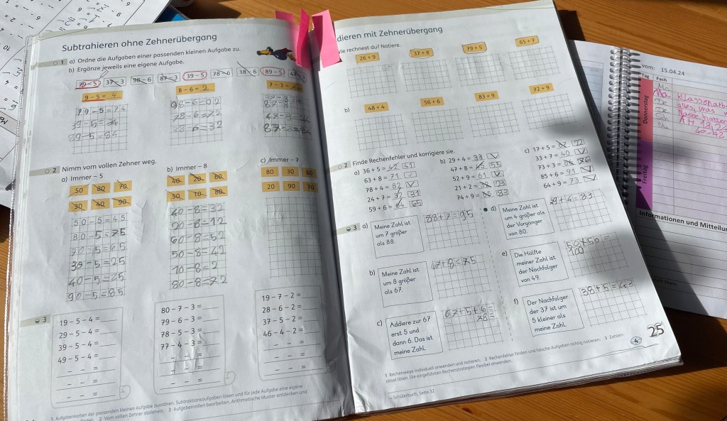 Zu Hause angekommen, schaute ich in Ls Mathearbeitsheft nach, welche Seiten wir am Wochenende in Vorbereitung auf die in der kommenden Woche anstehende Klassenarbeit durcharbeiten können. Vorrang werden vor allem die Aufgaben haben, bei denen L noch etwas Schwierigkeiten hat.