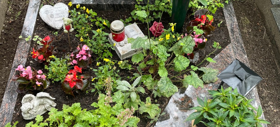 Das Wetter war mir hold. Nachmittags kümmerte ich mich endlich um Ms Grab, pflanzte einige Eisbegonien ein, säuberte die Umrandung und den Grabstein und stellte einen Strauß Rosen hin.