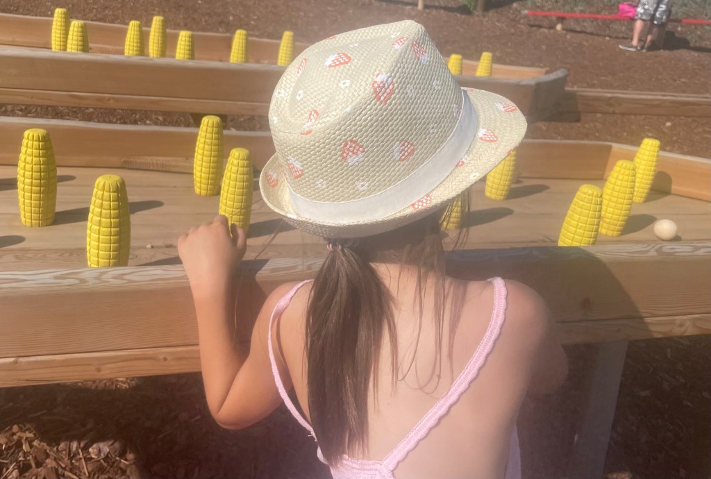 Weil es uns vergangene Woche so gut in Karls Erlebnis-Dorf mit Erdbeerhof gefallen hatte, fuhren wir mittags erneut nach Döbeln. Es war deutlich voller als bei unserem ersten Besuch und wir fanden nur mit Ach und Krach einen Parkplatz. Diesmal fuhren wir mit der Treggerbahn, bei der L Gas geben durfte, und probierten die Dinge aus, die wir beim letzten Mal nicht gesehen oder geschafft hatten. Besondere Freude hatte L bei der Murmelbahn. Hier verbrachten wir die meiste Zeit des Tages. Bevor wir abends nach Hause fuhren, kauften wir uns buntes Popcorn und leckere Erdbeerkekse, von denen wir bereits im Auto naschten.