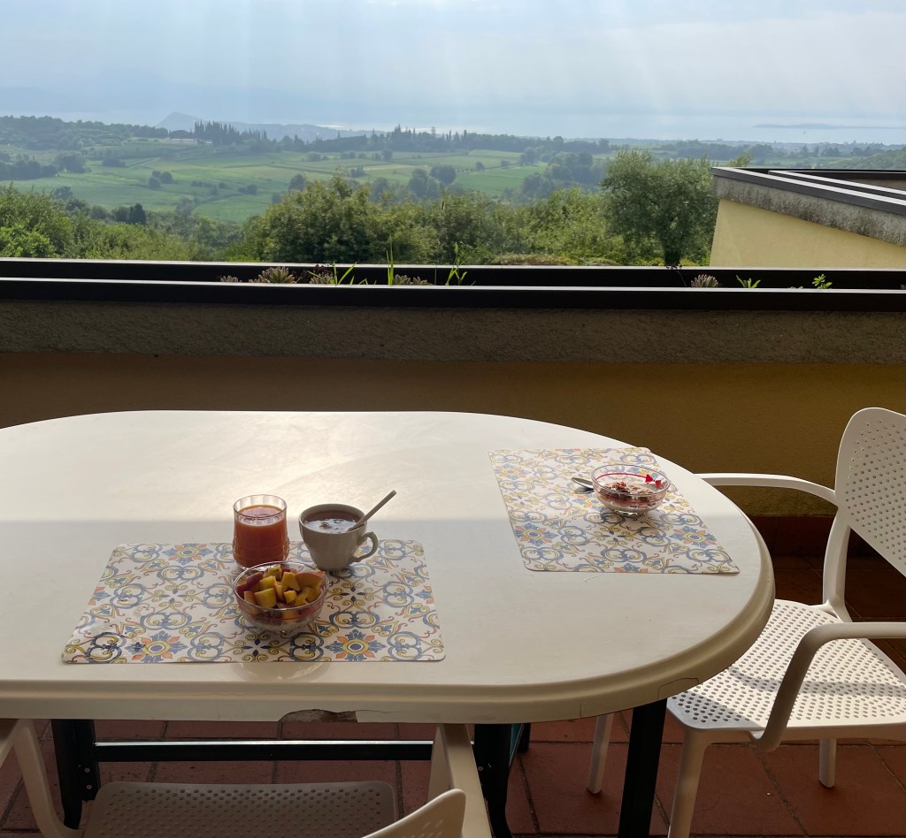 Ein letztes Frühstück auf der schönen Terrasse mit Blick auf den Gardasee. Erst vor wenigen Tagen realisierte ich, dass wir von unserem Apartment aus direkt auf das Ende des Sees und so beispielsweise auf den Ort Sirmione schauen können.