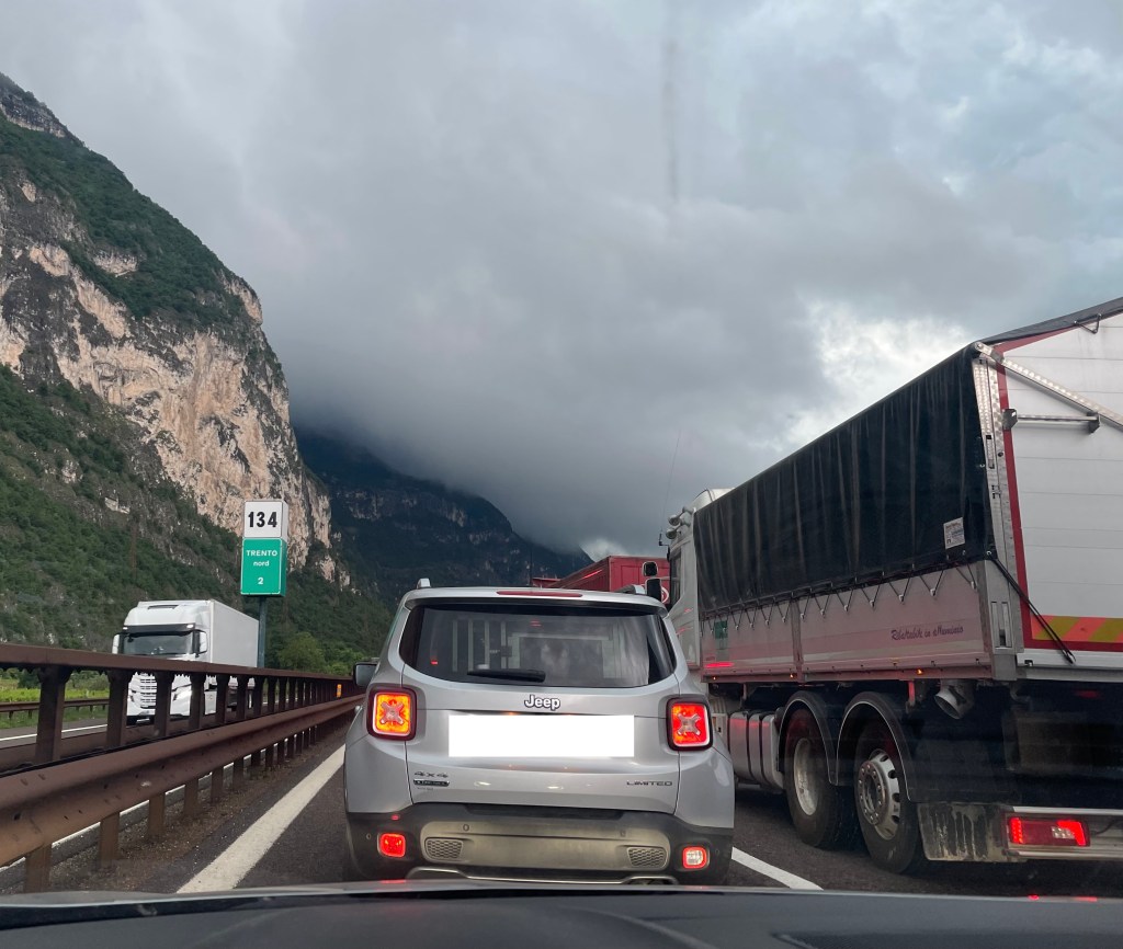 Zuerst hatten wir ein unglaublich schönes Panorama auf der italienischen Autobahn. Je weiter nördlich wir fuhren, umso dunkler wurden und tiefer hingen die Wolken, bis schließlich für mehrere Kilometer ein Gewitter direkt über uns war und Starkregen die Sicht massiv einschränkte. Das war genau das richtige für L und ihre Panik vor Unwetter. Ich zuckte zwar auch bei jedem Blitz zusammen und spürte meinen Adrenalinpegel steigen, hatte aber keine Zeit zum Angst haben. Ich wollte überleben.