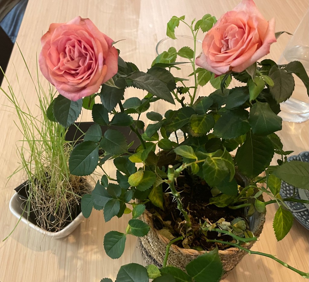 Die meinem Bruder und meiner Schwägerin J vor zwei Wochen in Obhut überlassenen Rosen, die ich zum Geburtstag geschenkt bekam, und Ls Ostergras leben noch. Darüber freute ich mich sehr.