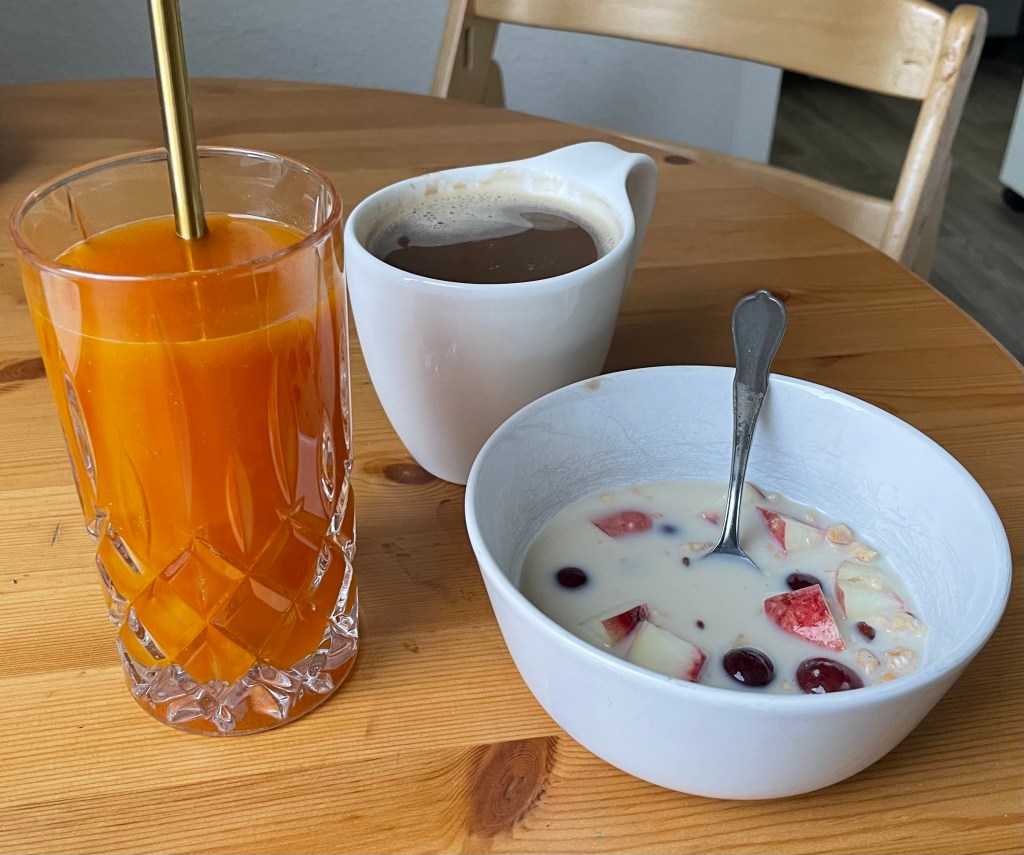Für mich gab es neben einem leckeren Schokocappuccino eine Schüssel Birchermüsli mit Pfirsich, Weintrauben und Pflanzenmilch sowie ein Glas LaVita-Saft.