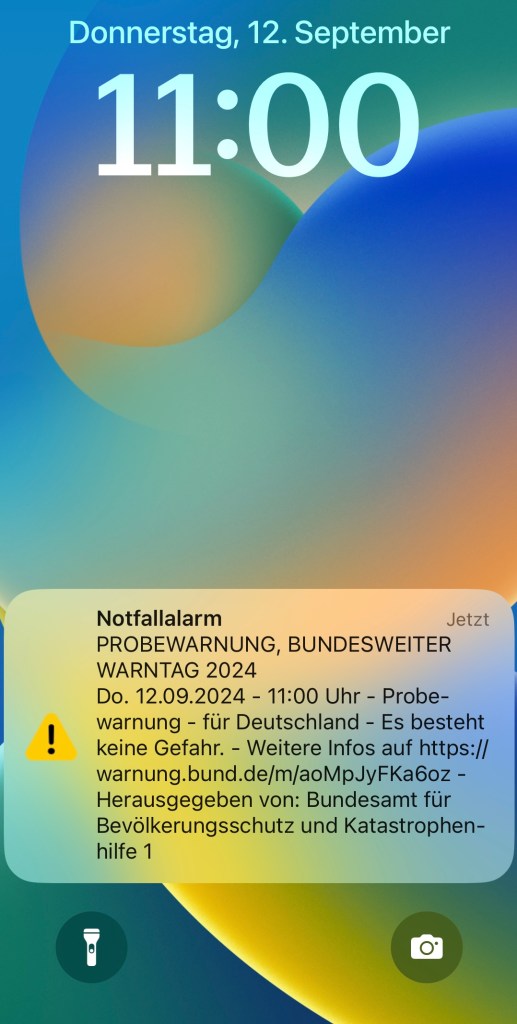 Trotz Vorwarnungen als Fließtext auf der Anzeige an der Haltestelle in der Nähe von Ls Schule und als Reminder in einem Slack-Channel habe ich mich Punkt elf Uhr erschrocken, als zuerst die Sirenen in Markkleeberg und kurz darauf der Warnton auf meinem Telefon losgingen. Immerhin wurde ich so daran erinnert, dass nun das wöchentliche Management Update stattfindet. Eine Dreiviertelstunde später erklangen erneut die Sirenen in Markkleeberg.