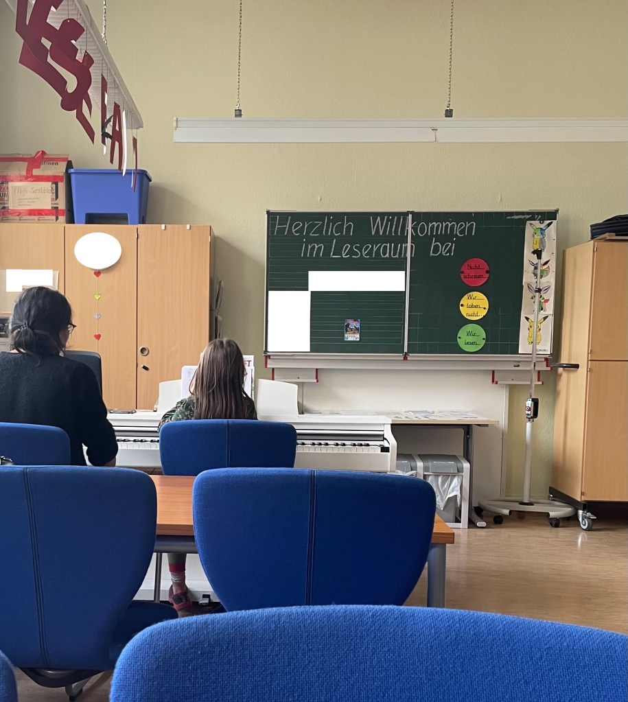 Direkt nach dem Abholen aus der Schule fuhren L und ich mit dem Auto zur Klavierstunde, die jeden Donnerstag in einer Grundschule ganz in der Nähe stattfindet. Während L Fingerübungen macht, Noten gezeigt und erklärt bekommt und Stücke spielt, bestaune ich jedesmal die schöne Bibliothek des Lesezimmers. Ich liebe Bücher sehr und fühle mich wie im Paradies, auch wenn es sich bei nahezu jedem Werk um eines für Kinder handelt.