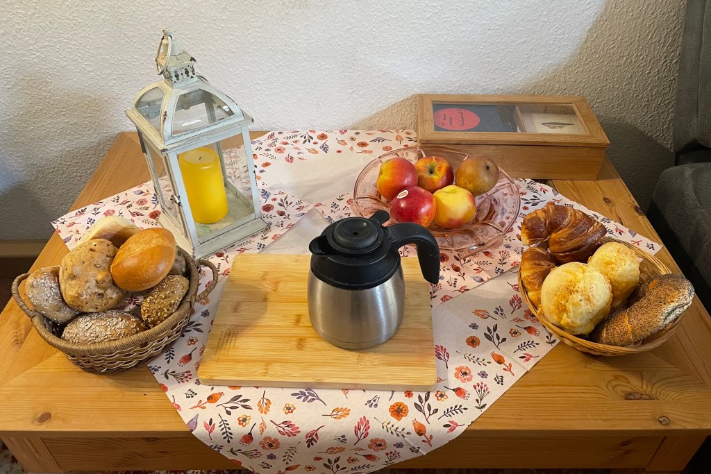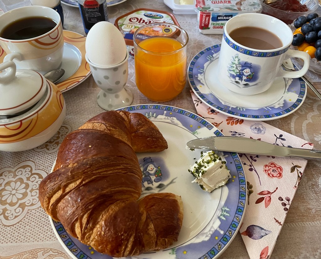 Gemeinsam mit meinem Bruder und meiner Schwägerin J, die gestern aus München angereist kamen, frühstückten wir etwa anderthalb Stunden später bei meinen Eltern. Für mich gab es ein leckeres Croissant mit Frischkäse und dazu eine Tasse Schokocappuccino.