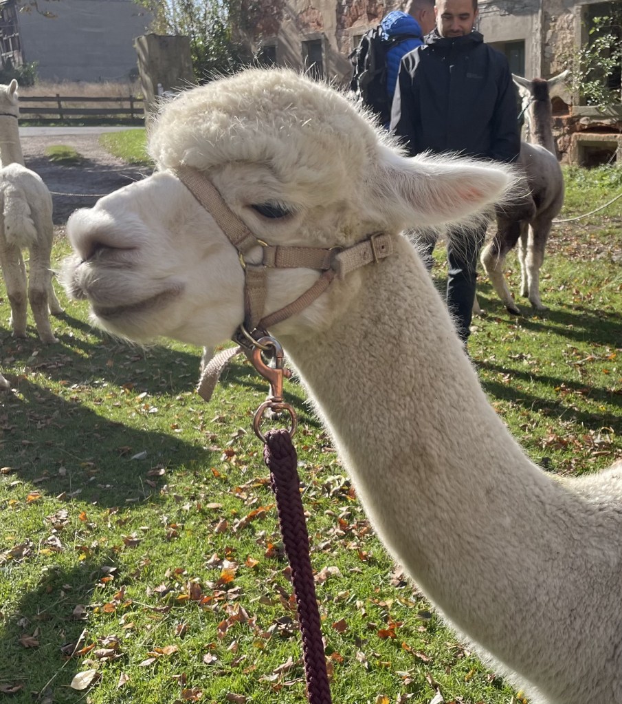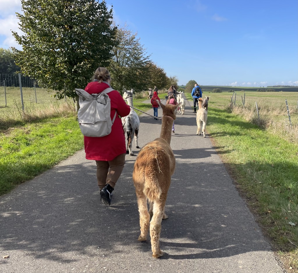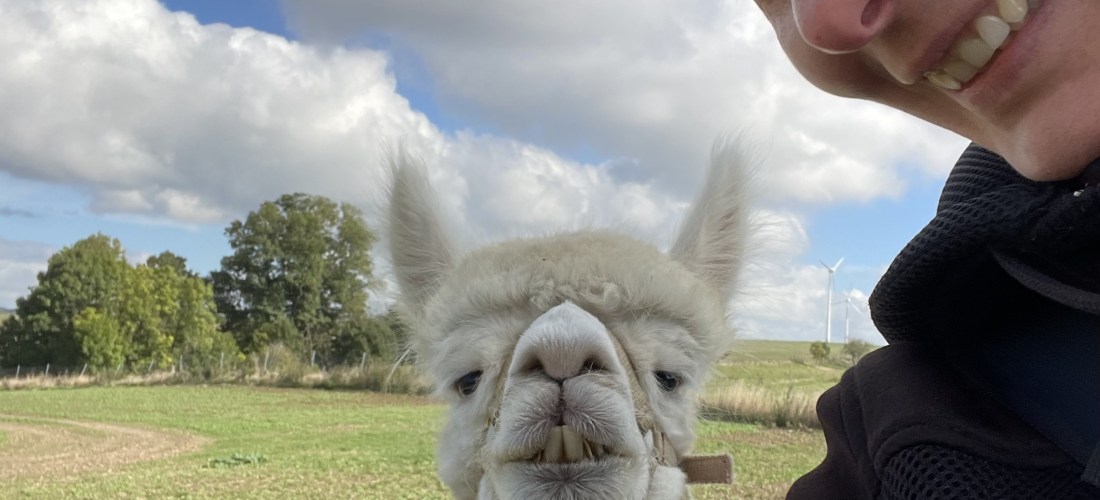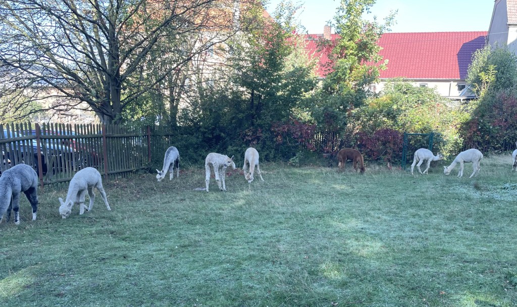 Gleich nach dem Frühstück fuhren L und ich mit dem Auto in den Ort Wermsdorf in Nordsachsen. Dort löste ich mein Geburtstagsgeschenk ein und nahm gemeinsam mit L an einer Alpaka-Wanderung teil. Gebucht hatte ich einen Termin für einen Alpaka-Spaziergang. Mit der Zahlung einiger Euro upgradete ich diesen zu einer Wanderung. Wir wären sonst die einzigen gewesen, die vorzeitig hätten umkehren müssen.
