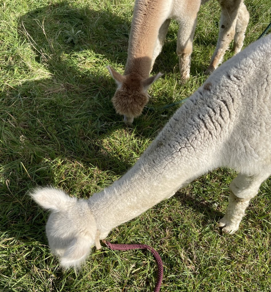 Insgesamt waren wir zehn Teilnehmer*innen. (Naiv wie ich bin, glaubte ich im Vorfeld allen ernstes, L und ich wären die einzigen bei der Wanderung.) Uns wurden zuerst die Jungtiere gezeigt, die letztes Jahr geboren wurden. Während wir dem Dutzend Alpakas beim Grasen zuschauten, lernten wir allerhand über die Zucht, die Verarbeitung der Wolle und die Wanderungen mit den Tieren. Danach wurden wir in den Hofladen geführt, in dem es sehr schöne (und ausgesprochen teure) Sachen aus Alpakawolle zu kaufen gibt. L verliebte sich in ein super flauschiges Affen-Kuscheltier und kaufte sich dieses von ihrem Taschengeld. Die kleine Differenz, die ihr fehlte, bekam sie von mir.