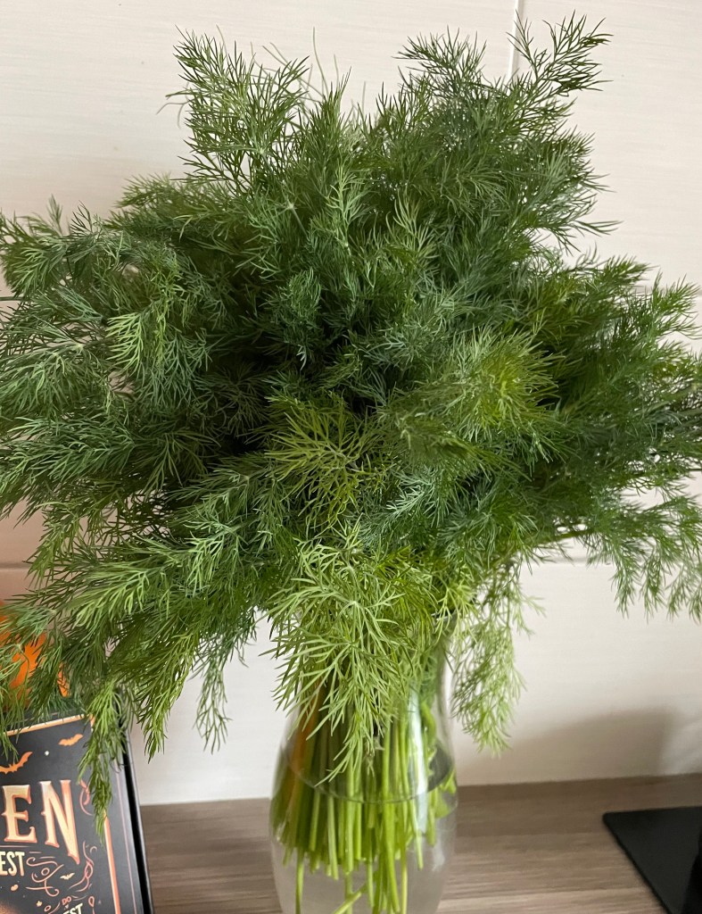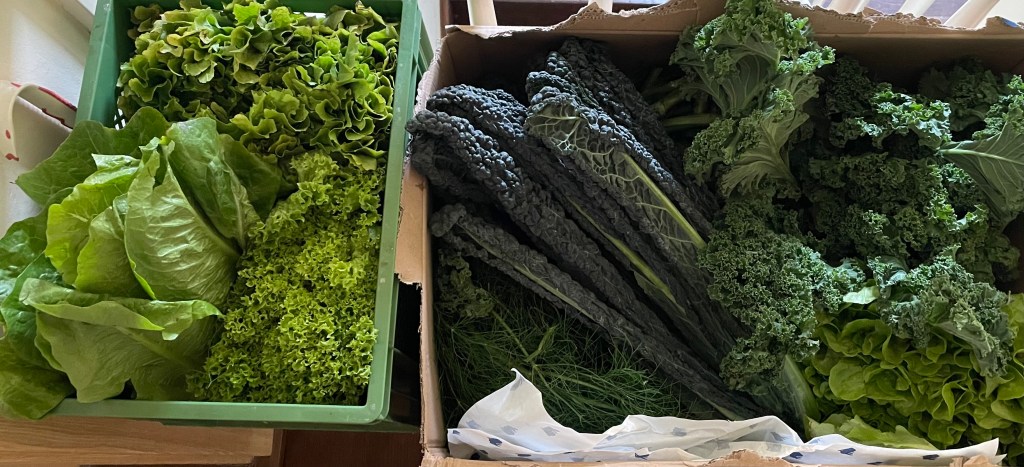 Vormittags wurde Ellis und Waltrauds erste Kaninchenkiste geliefert, die ich bereits sehnsüchtig erwartet habe. Sechs Kilogramm Grünfutter in Form von Salaten und Kräutern befanden sich darin. Die Kräuter stellte ich gleich ins Wasser. Zudem sortierte ich die Salate nach ihrer Frische und möglichen Haltbarkeitsdauer. Circa sieben Tage dürfte das Futter für die beiden reichen.