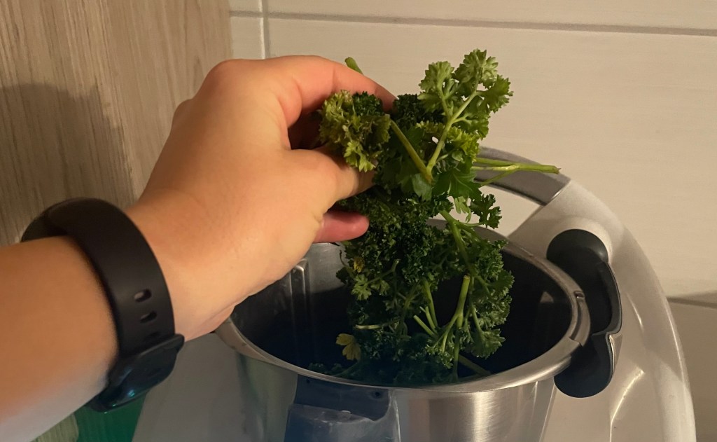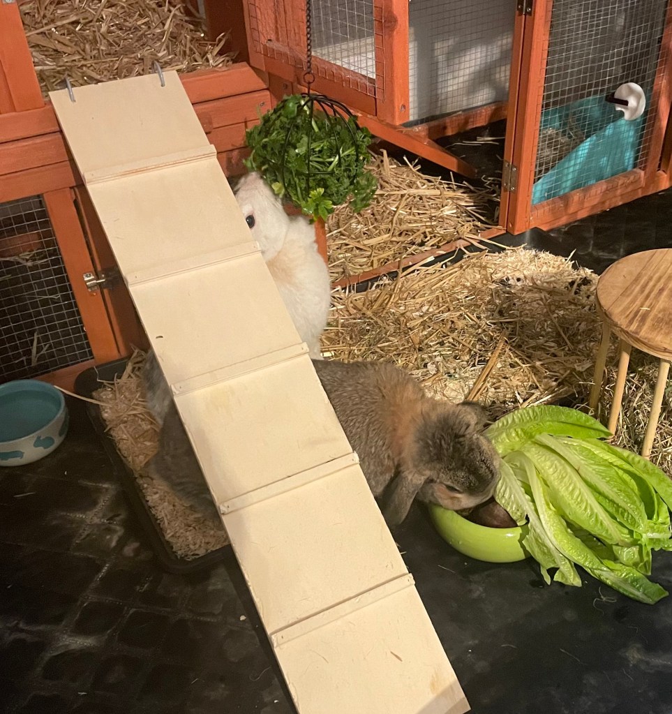 Anschließend bekamen unsere beiden Kaninchen Elli und Waltraud frisches Grünfutter. Da Elli ein gutes halbes Kilogramm zu schwer ist, wiege ich das Futter seit einigen Wochen mithilfe der im Thermomix integrierten Waage ab. Ich kehrte noch den gröbsten Dreck im und vor dem Käfig weg und stellte die Futternäpfe hinein. Die beiden stürzten sich ausgehungert und freudig auf ihr Fressen.