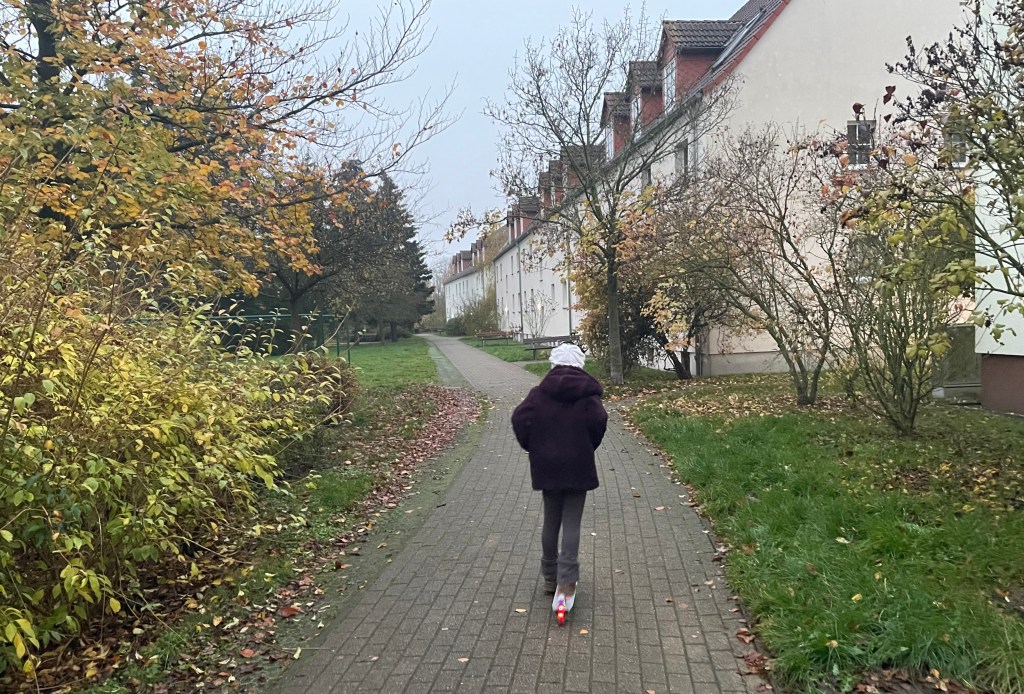 Nach unserer morgendlichen Badrunde, bei der L heute sehr gut mitzog, verließen wir zeitiger als gestern die Wohnung in Richtung Auto. L fuhr die paar Meter bis zu unserem Parkplatz mit ihrem Roller.